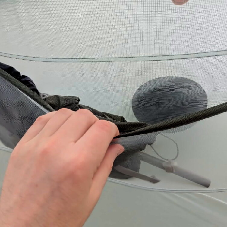 Die beiden Planen an den Eingängen werden jeweils mit einem Hering abgespannt und bilden dadurch die zwei großen Apsiden. Die Apsiden dürften mit zu den geräumigsten bei diesem Zelttyp zählen, die ich bis jetzt gesehen habe. Natürlich kann man die Planen auch offenlassen – entweder halb oder ganz. Dazu rolltst du die Planen zusammen und befestigst sie mittels großer Plastikhaken am Rand des Innenzelts.