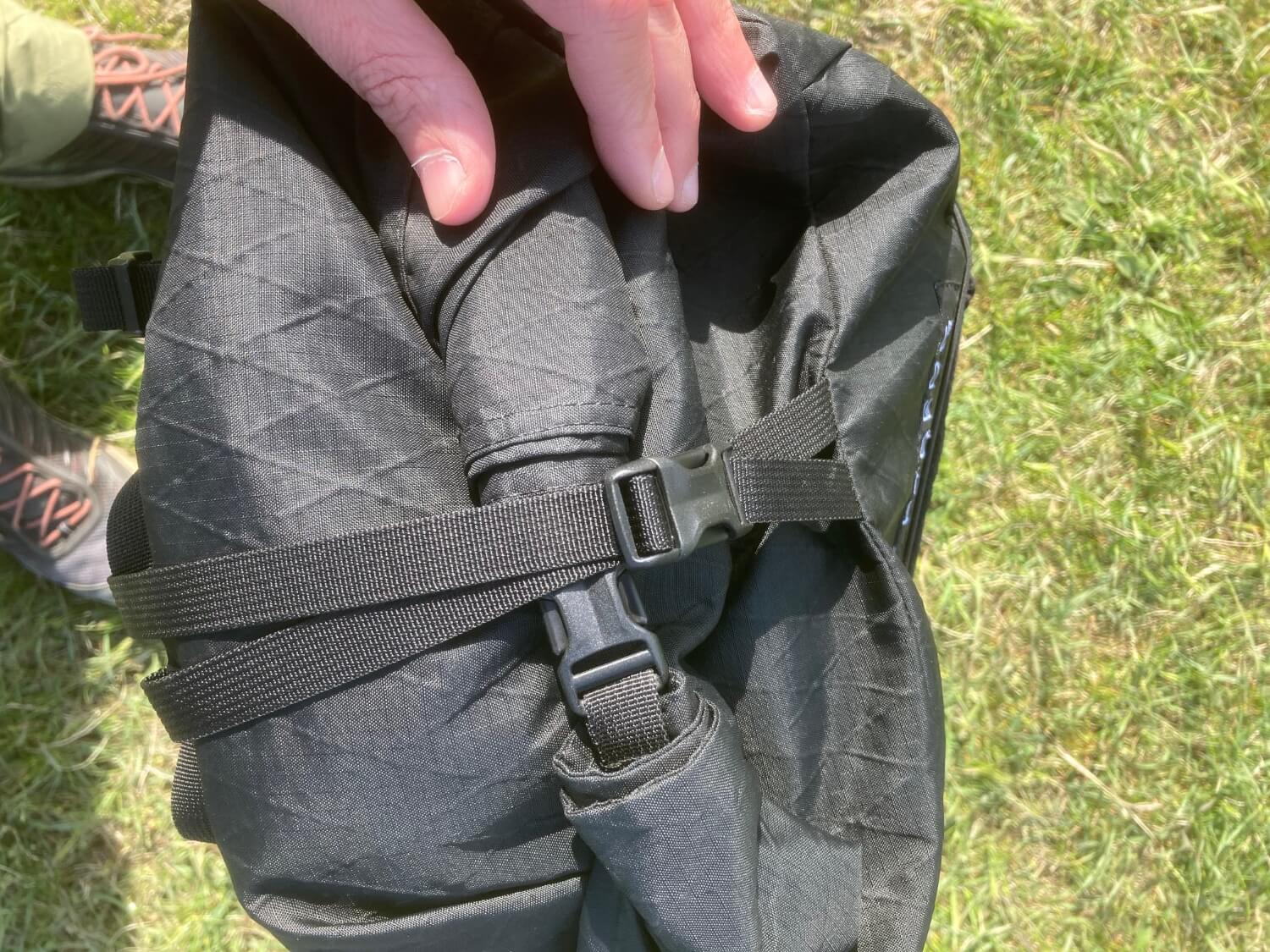 Am oberen Ende des Rucksacks befindet sich ein Lastkontrollriemen, den man über dem Rolltop-Verschluss zusammenklippt, um den Rucksack sauber zu verschließen. Im Internet gibt es einige Benutzer, die sich darüber beschwert haben, dass dieser Riemen zu weit unten sitzt. Für mich war das kein Problem, da der Riemen viel Spielraum hat.