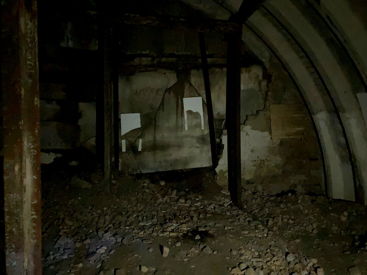 Ein weiterer schmaler Tunnel führt in eine zweite baugleiche Halle. Die Wände sind eingestürzt, auf beiden Seiten türmen sich Schuttberge auf. Mit angehaltenem Atem tasten wir uns langsam vorwärts. Auf der Seite zweigt ein weiterer Tunnel in die Finsternis ab.