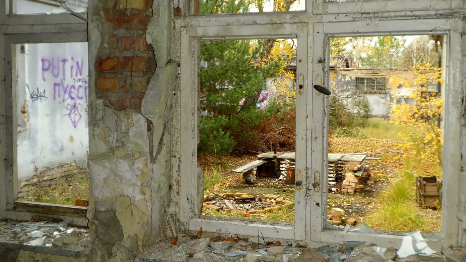 Ein großer Speisesaal ist noch gut als solcher zu erkennen. Auf der einen Seite hinter einem Gitter die Essensausgabe, an der Wand kitschige Blümchenbilder, ein Balalaikaspieler und tanzende Frauen. Ein Wunder, dass die Malereien noch so gut erhalten sind. In ein paar Jahren wird wahrscheinlich nicht mehr viel übrig sein.