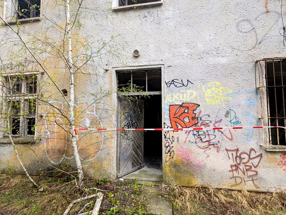 Schließlich erreichen wir eine Schranke, dahinter die Überreste eines Pförtnerhäuschens. Ein Schild am Baum informiert uns, dass wir militärisches Sperrgelände betreten. „Von der Liegenschaft gehen erhebliche Gefahren für Leben und Gesundheit aus.“ Wir nehmen die Warnung zur Kenntnis, aber das kann uns jetzt auch nicht mehr aufhalten.