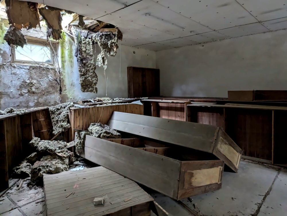 Das Innere der Gebäude ist in einem schrecklichen Zustand. Putz blättert in dicken Flocken von den Wänden. Die nackten Decken und Wände sind an vielen Stellen eingestürzt. In einigen Räumen ragen uns die Holzdielen in grotesken Winkeln entgegen. Obwohl die Gebäude offenstehen und den Elementen fast ungeschützt ausgeliefert sind, liegt ein muffiger Geruch in der Luft.