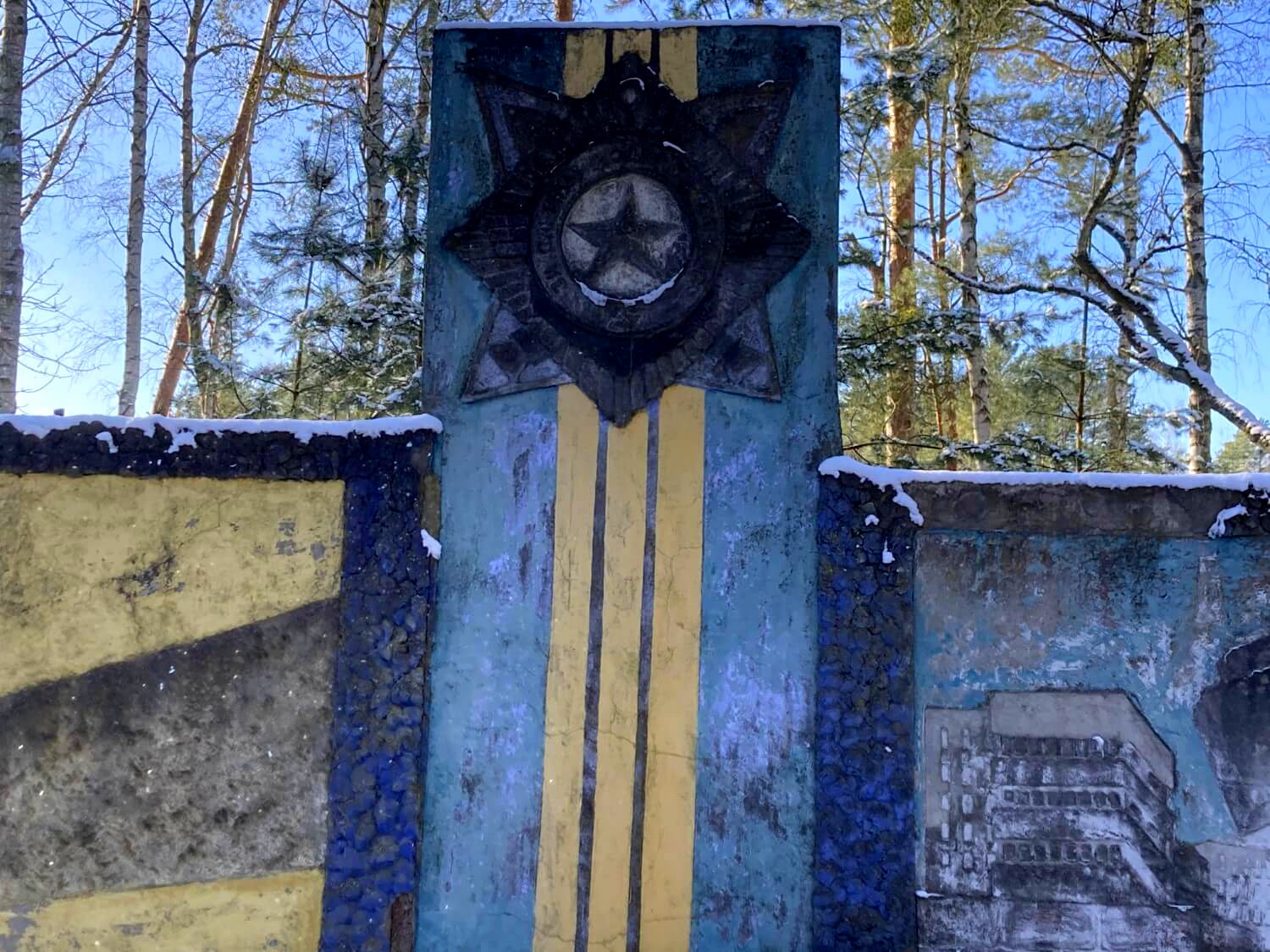 An einer Mauer finden wir die Überreste eines Wandreliefs, das in den Stein gehauen ist. Wie zu erwarten martialische Szenen: Arbeiter an Maschinengewehren, der Sowjetstern, ein Raketenpanzer beim Angriff. Nebendran das finstere Gesicht eines Soldaten, das aber vermutlich ein Graffiti neueren Datums ist.