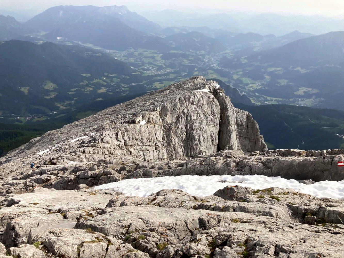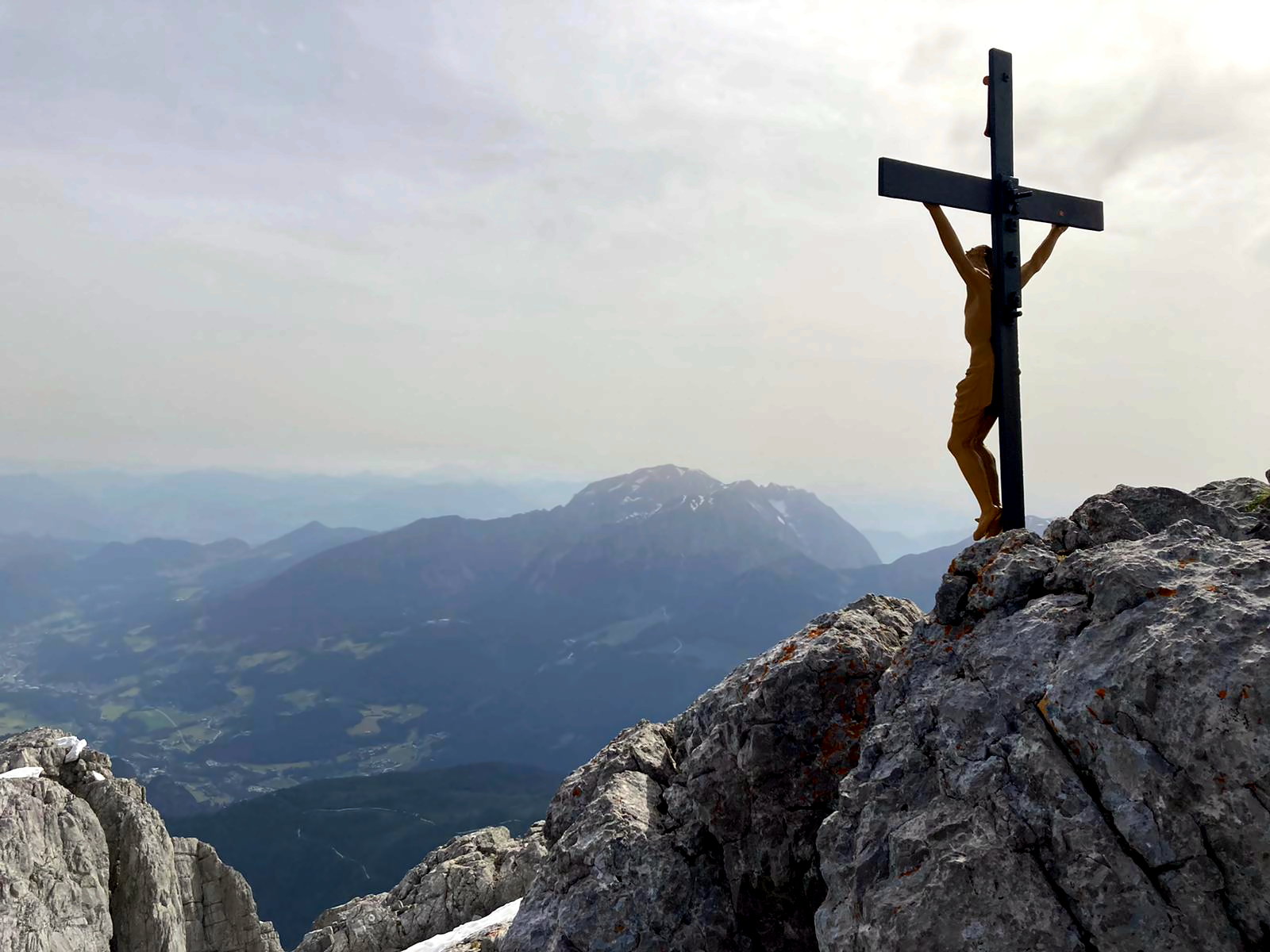 Auch wenn ich eben Spaziergang geschrieben hab – die Tour ist eine Bergwanderung in recht steilem und felsigen Gelände. Im Prinzip ist der Weg aber unkompliziert und gut markiert. Etwa auf 2/3 des Wegs überwinden wir eine etwa 10 Meter hohe Steilstufe, die aber mit Drahtseilen entschärft ist. Am Ende folgt noch eine kurze Kraxelei über Felsplatten bis wir am Gipfelkreuz stehen und mit einem umwerfenden 360°-Ausblick über das Berchtesgadener Land belohnt werden.