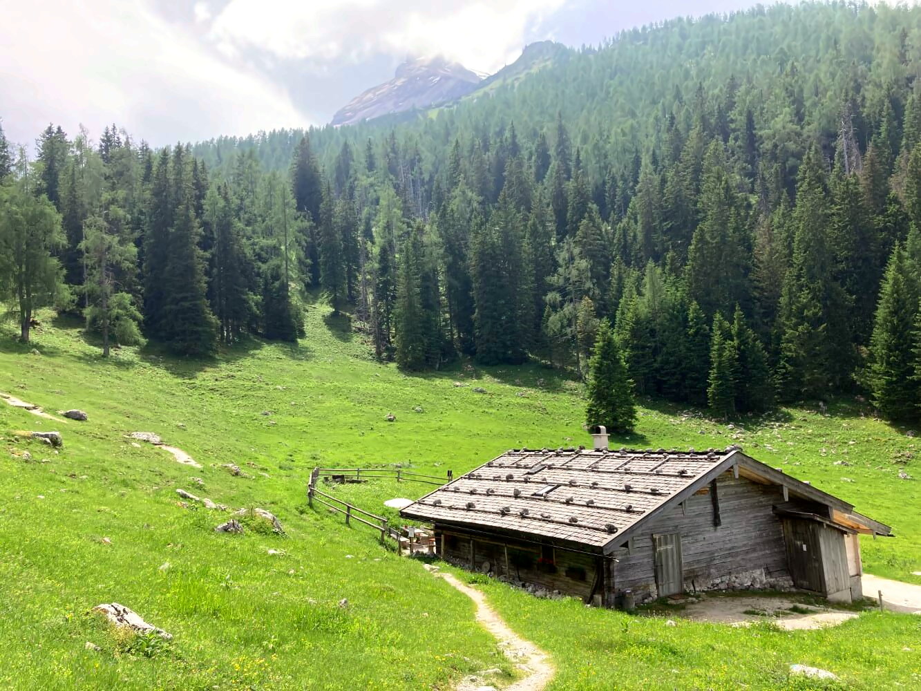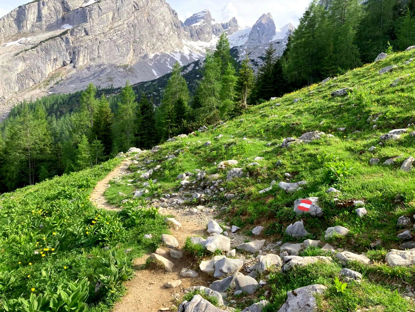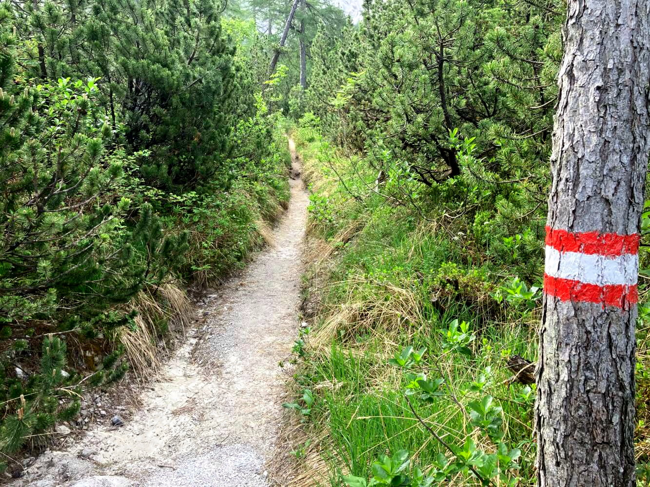 Vom Kärlingerhaus geht es zunächst leicht aufsteigend auf einen Bergweg zwischen Schneiber und Simertsberg. Ungefähr auf der Höhe der alten Grüberl-Diensthütte erreichen wir den höchste Punkt auf 1670 Metern – ab dann geht es nur noch ganz entspannt herunter. Unterwegs bieten sich einige tolle Ausblicke auf die Hachelköpfe im Süden.