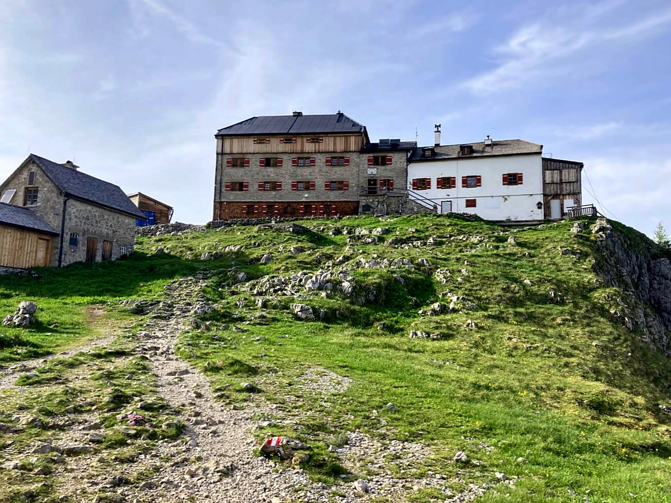 Als ich vom Pass aus nach rechts oben schaue, sehe ich weit vor mir das Ingolstädter Haus oberhalb des Talkessels. Es liegt nicht direkt am Weg, aber wir entscheiden uns trotzdem hinzulaufen. Der Weg dahin dauert etwa 40 Minuten (einfach). Ich würde den kurzen Abstecher auf jeden Fall empfehlen, allein die Sonnenterrasse in einmaliger Lage lohnt den Umweg.