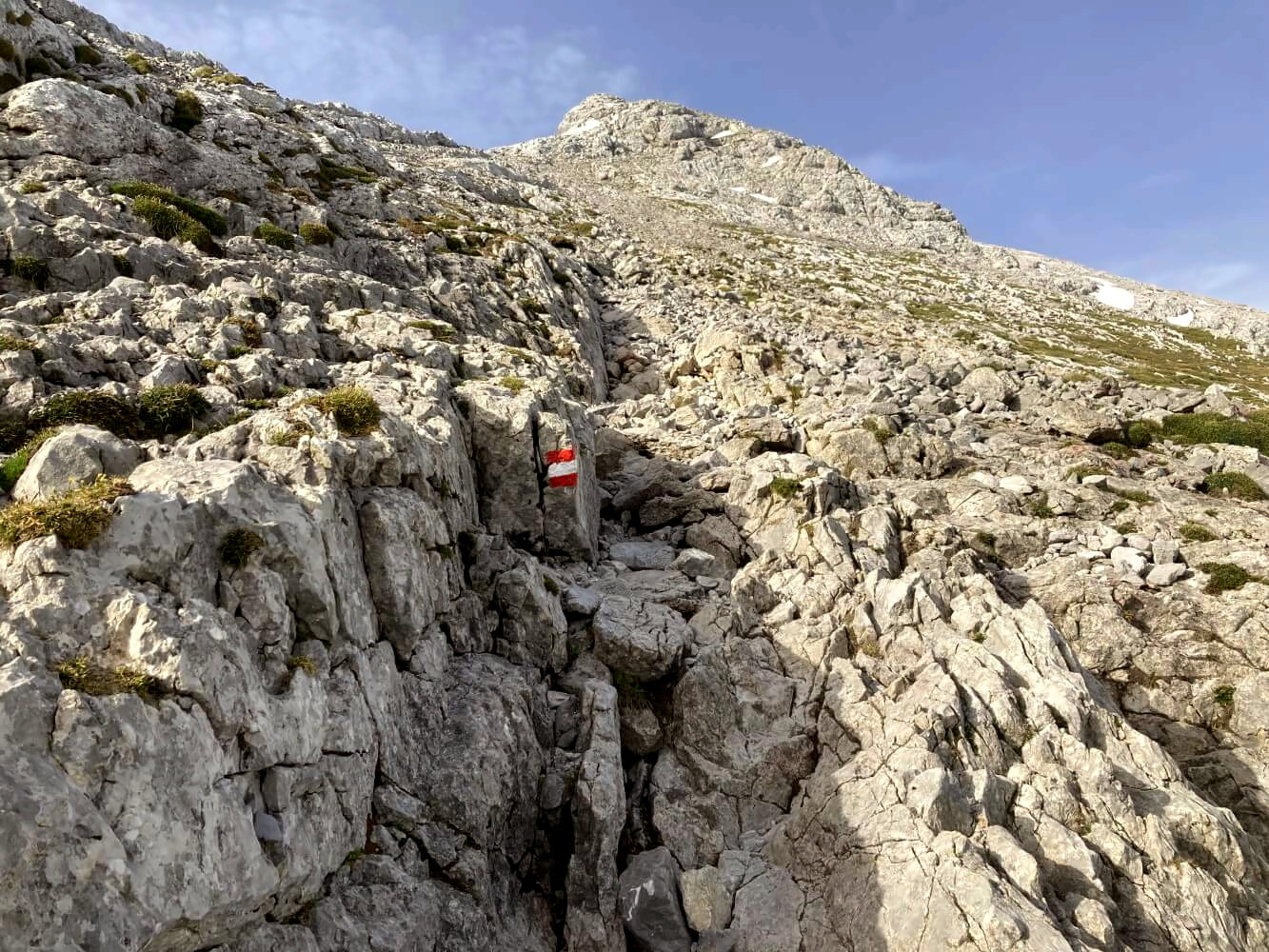 Ein bisschen hängt das natürlich immer vom vorigen Winter ab. Wenn besonders viel Schnee gefallen ist, können sich die Schneefelder auch noch bis in den August halten. Zur Sicherheit empfiehlt es sich daher, mindestens ein Paar Grödel bzw. Microspikes* dabeizuhaben. Für Wanderungen Anfang Juni sollten Leichtsteigeisen* und Pickel* in den Rucksack. Vor Juni ist die Tour für „normale“ Wanderer ohne alpinistischen Background nicht zu empfehlen.