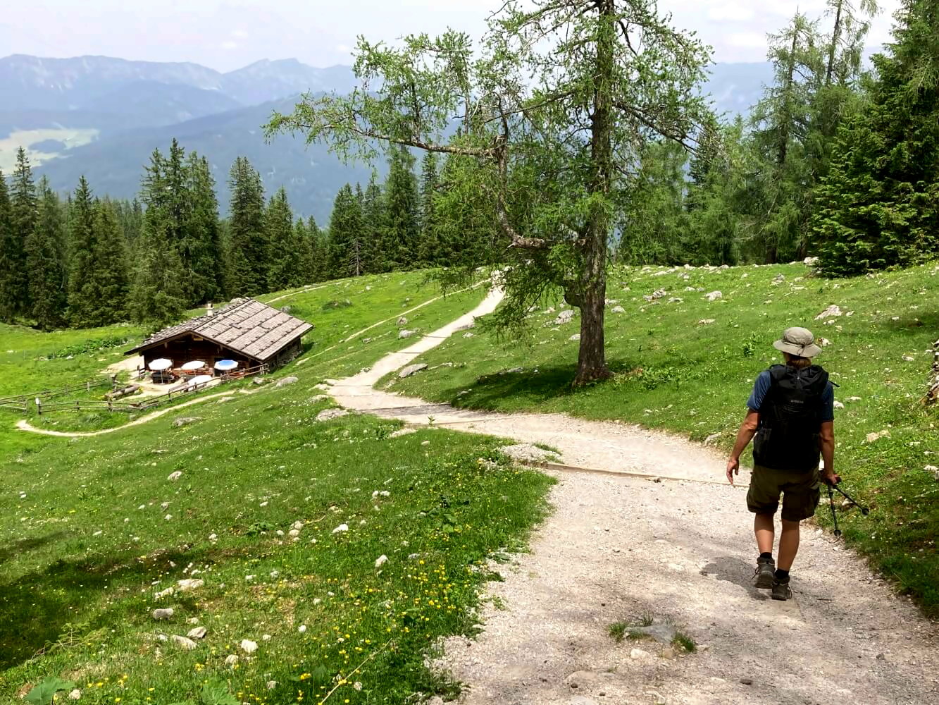 Nach dem erneuten Abstieg zum Watzmannhaus geht es direkt weiter und zwar auf dem gleichen Weg wie gestern zurück zur Falzalm. Hier angekommen halten wir uns aber links auf dem Weg 441, der an der Mitterkaseralm bis zur Stubenalm führt. Die Landschaft ist größtenteils offen und bietet schöne Ausblicke über dichte Wälder, Almwiesen und die Berggipfel nördlich des Königsees.