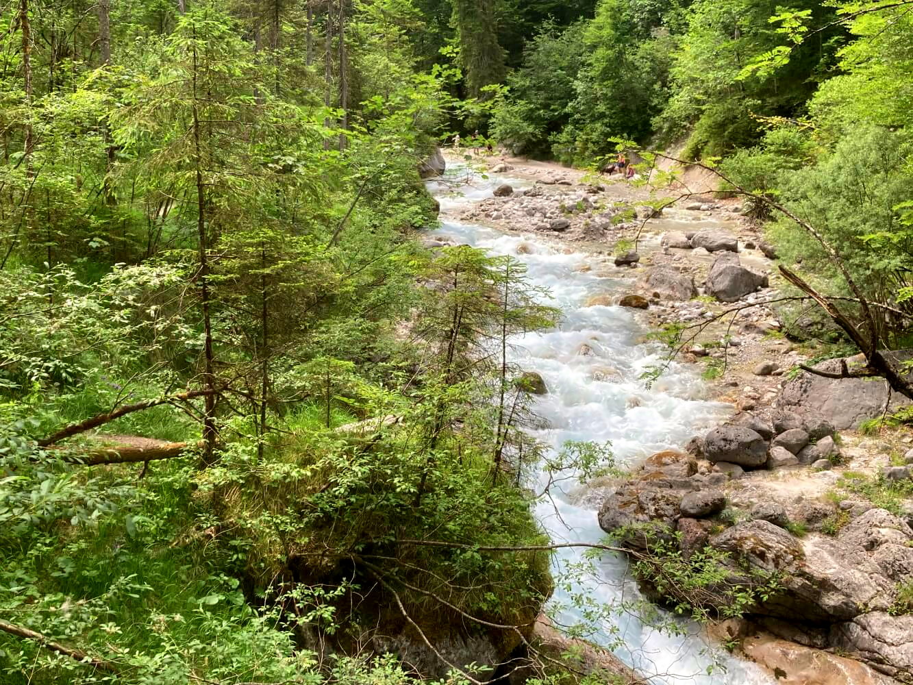 Danach führt die Route bis zur Wimbachklamm auf einem steil abfallenden, ziemlich unerfreulichen Forstweg mit viel Schotter durch dichten Wald. Der Weg ist relativ rutschig, mit den Wanderstöcken ist es aber gerade so erträglich. Ein paar andere Wanderer, die wir später treffen, haben ungefähr den gleichen Eindruck: Macht keinen Spaß, aber muss man durch.