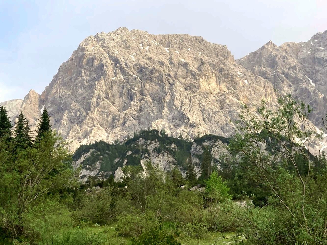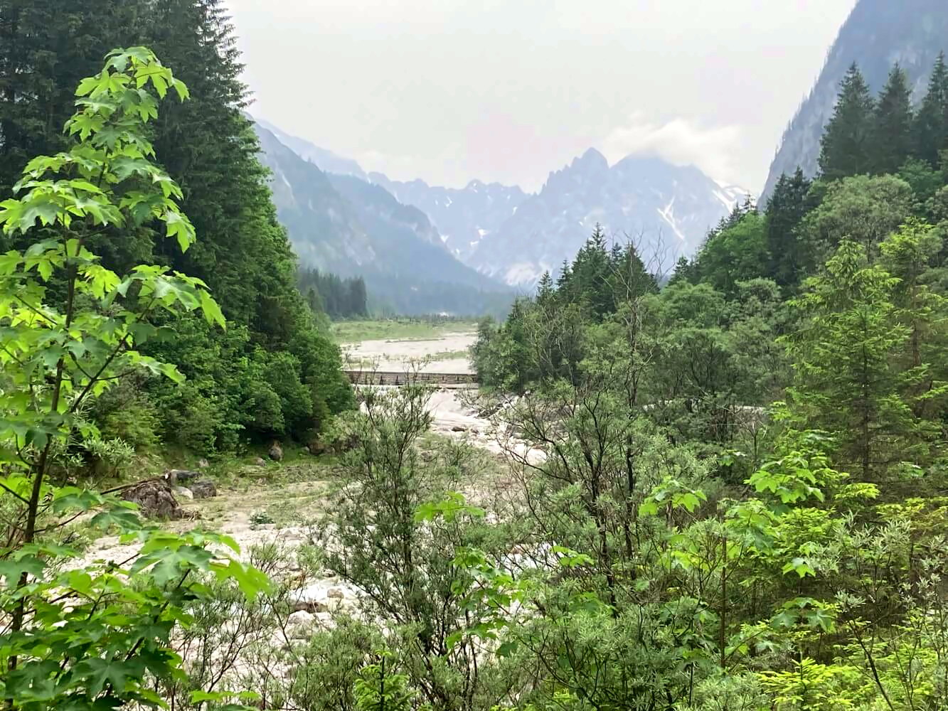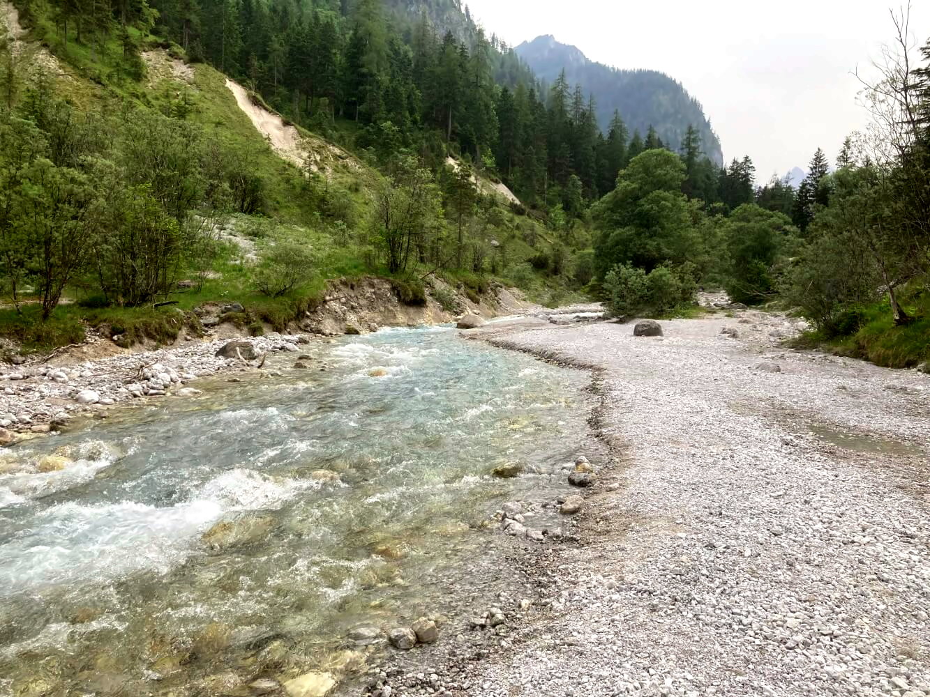 Danach wird es entspannter: Wir überqueren die Brücke über die Wimbachklamm und laufen stetig bergan durch das weitläufige, mit lichten Kiefernwäldern bewaldete Wimbachgries. Zur linken Seite die graue Eminenz des Watzmanns, rechts der steil aufragende Hochkalter und seine Nebengipfel, dazwischen riesige Schotterflächen, die von den umliegenden Bergen herabgetragen werden.