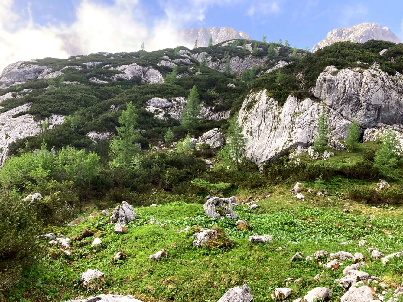 Hinter der Wimbachgrieshütte steigt der Weg direkt durch den Bergwald an und führt in vielen Kehren zum Banngraben, der den östlichen Talabschluss markiert. In teils gewagter Wegführung direkt entlang der Steilwand führt die Route weiter hoch zur verfallenen Trischübelalm. Entgegen der Markierung auf der Karte finden wir hier kein Gebäude, nur eine ziemlich zugewachsene Fläche, auf der sich früher vielleicht einmal ein Feld befand.