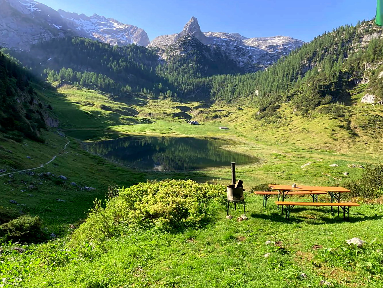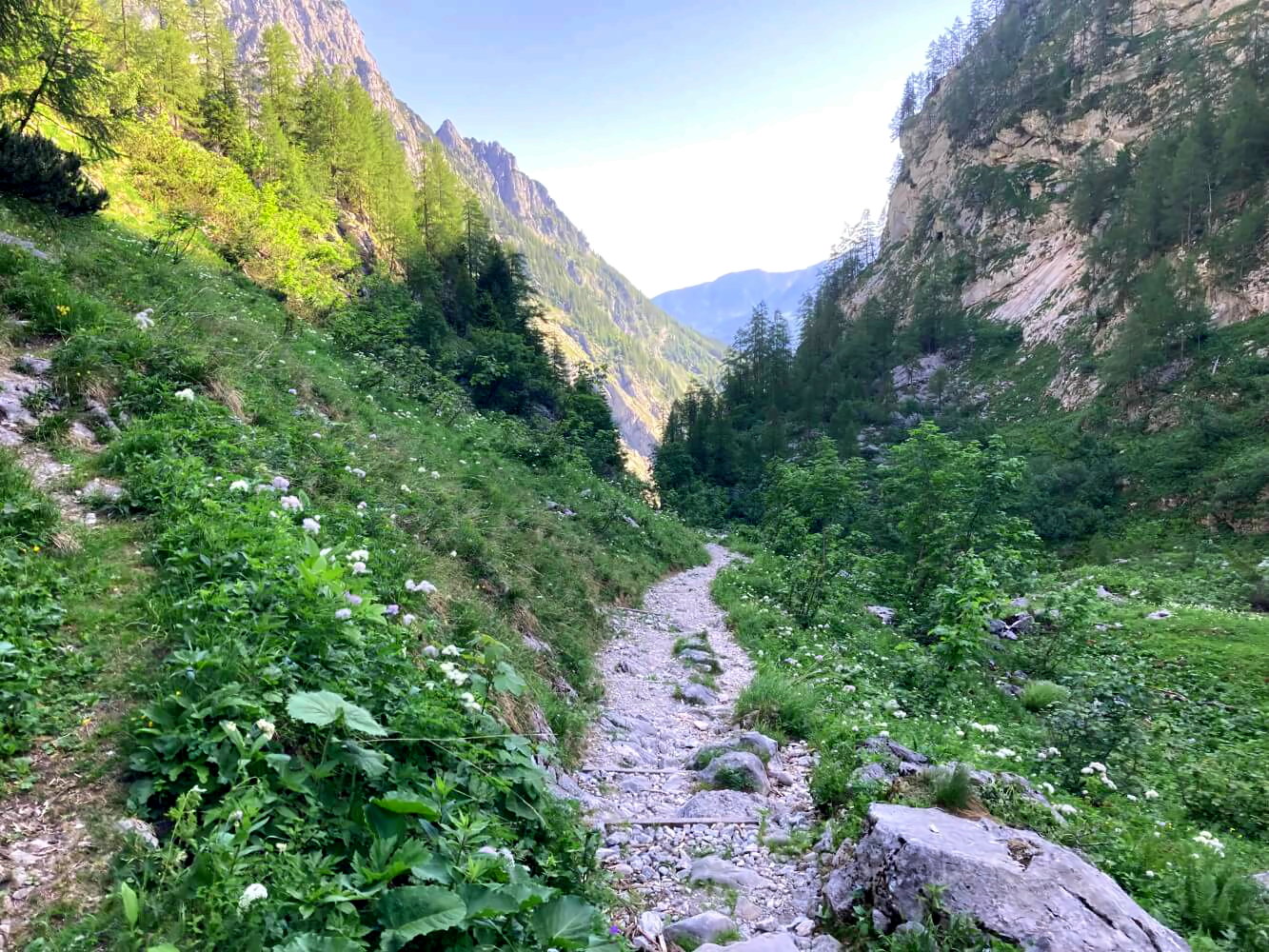 Zum Schluss wird es dann wieder etwas grüner. Noch ein paar bewaldete Täler und wir erreichen das Kärlingerhaus in einem weitläufigen sanft abfallenden Talkessel am Funtensee.
