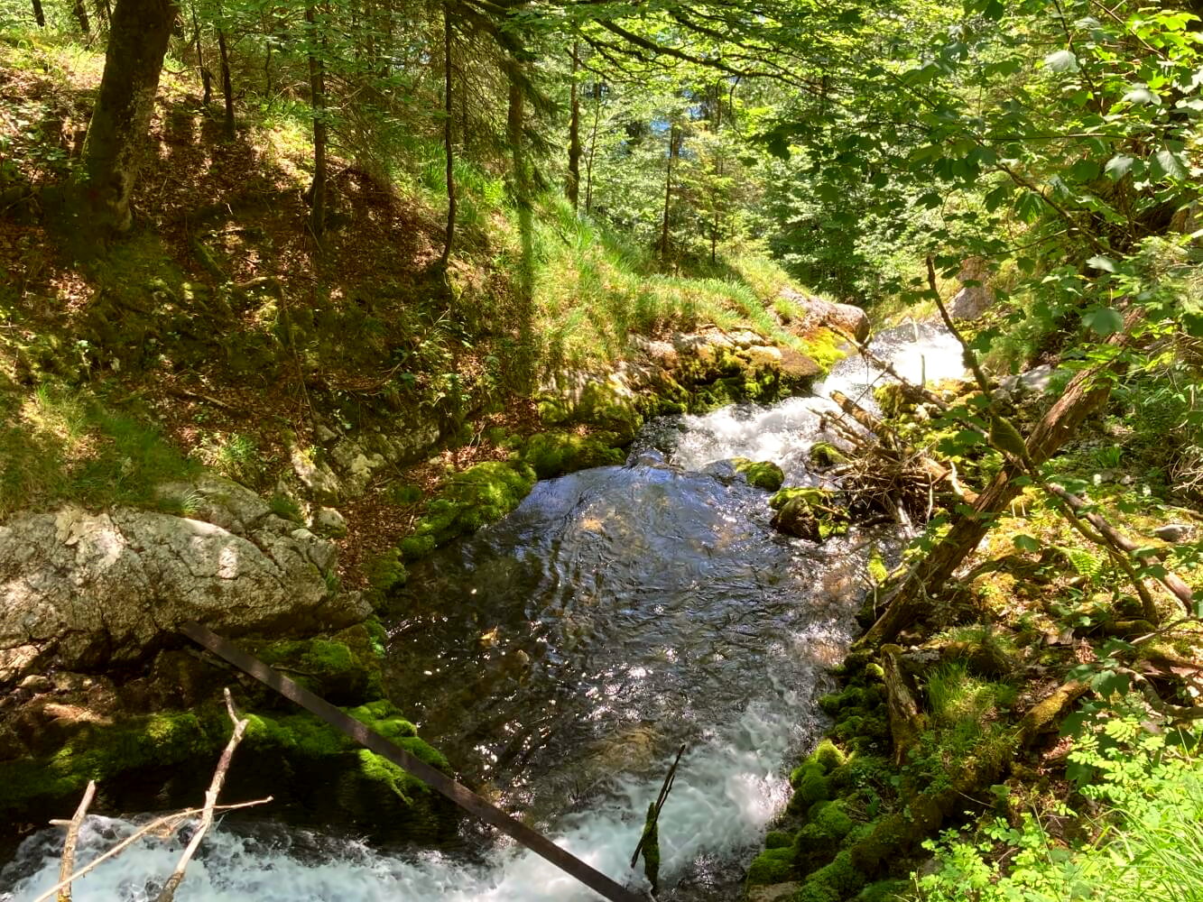 Unten angekommen geht es durch ein bezauberndes Wäldchen an der aufgegebenen Schrainbachalm vorbei weiter. Teilweise verläuft der Weg auch direkt am Bach entlang – perfekt um sich kurz die Füße abzukühlen. Zwischen den Bäumen sehen wir jetzt auch schon das türkisblaue Wasser des Königssees unter uns funkeln.