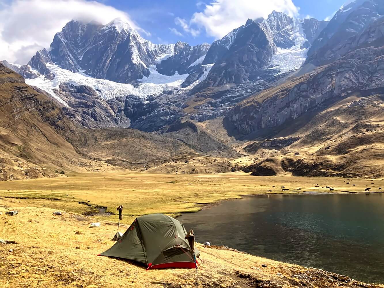 Campamento Huayhuash is perhaps the most beautiful camp so far despite not being directly situated at a lake. It’s in a huge valley hollow, framed by the jagged peaks of the mighty Trapecio Massif. It reminds me of a wilder, larger, kind of Andean version of the famous Dolomites in Europe. An immensely wild, primeval landscape which shrinks tents, shelters and people to the size of toys.