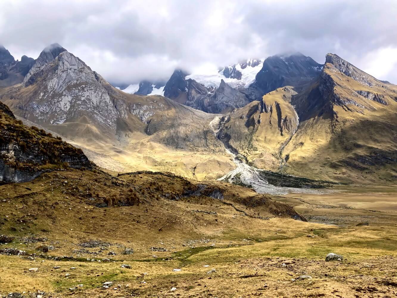About two hours before reaching Laguna Jahuacocha, the landscape transforms. The mountains of the Huayhuash range, long hidden from view, suddenly loom nearby. The sight of Yerupaja Grande and Jirishanca is breathtaking, even with their peaks now covered in clouds. The craggy cliffs towering above on either side of the valley are just as captivating, though. I feel tiny, like an ant crawling at the bottom of an arena built for giants.