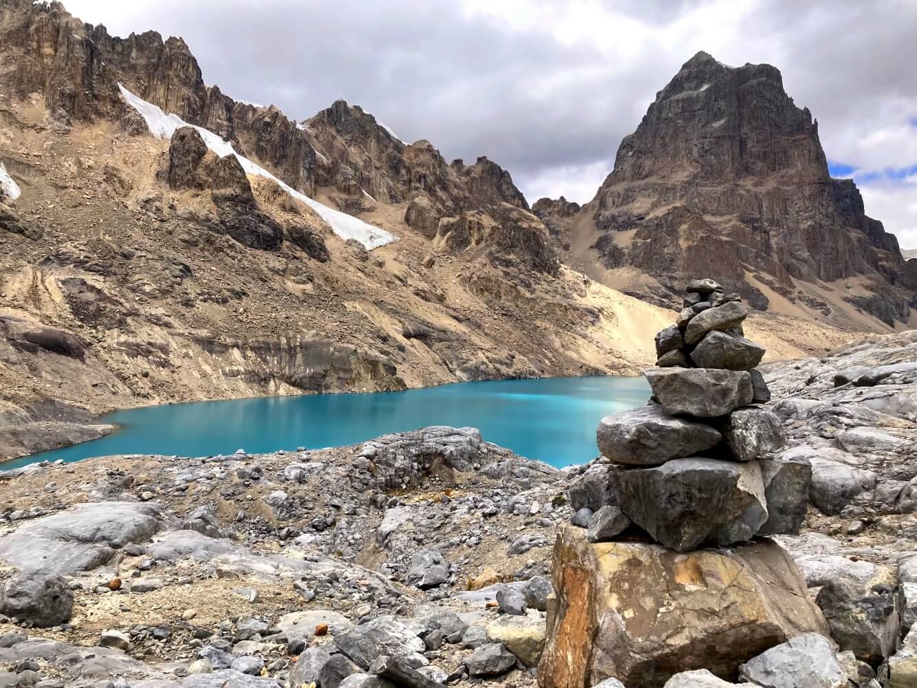 The landscape is extremely barren—much more so than the nearby Cordillera Blanca. It’s a world of endless brown hills suddenly giving way to jagged, glacier-topped peaks, sharp rock spires, and towering ice walls. Numerous turquoise-blue glacier lakes provide a striking contrast to this stark terrain.
