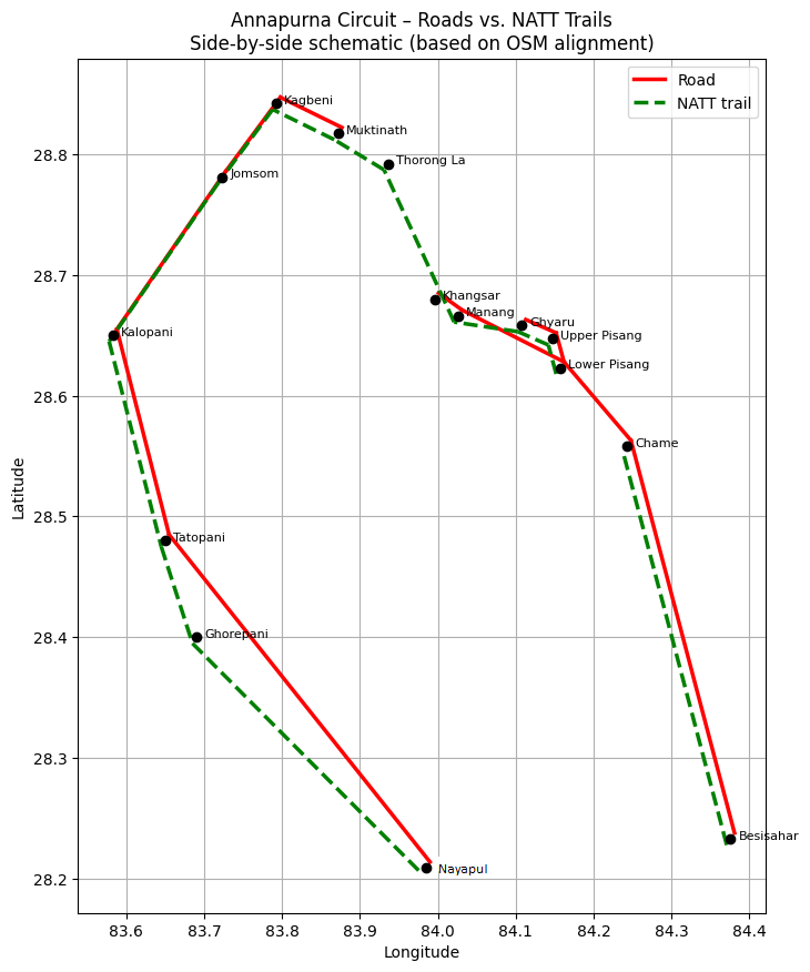 correct – the GPX file includes all the above mentioned NATT-trails because this is the more enjoyable trek today. As mentioned, the classic Annapurna route has been turned into a jeep track on many parts.