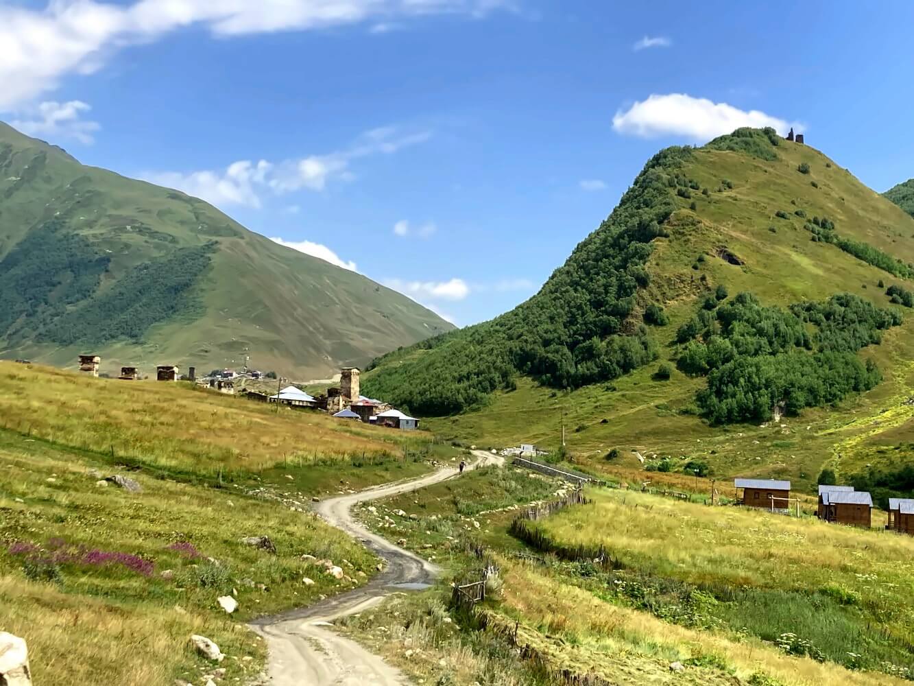 Leider ist dieser schöne Teil dann aber auch irgendwann vorbei. Kurz vor Ushguli führt der Weg in einer Schleife runter ins Tal. Ab hier läuft man dann noch ca. 2,5 Kilometer auf der staubigen Straße nach Ushguli. Nicht gerade der perfekte Abschluss. Aber die Aussicht auf das Dorf, das mit seinen Wehrtürmen langsam am Horizont auftaucht, entschädigt dann doch etwas für die Pistenwanderung.