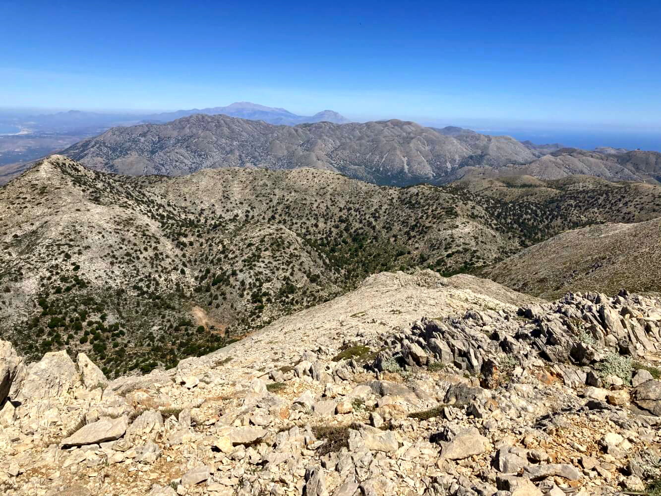 Oben angekommen gibt’s den ersten umwerfenden Weitblick nach Norden und Osten. Geradeaus kannst du bis Chania zum Meer schauen, bei gutem Wetter sogar bis Heraklion weit im Osten. Eigentlich ein super Ort, für eine kleine Pause nach der ganzen Kraxelei. Allerdings ist es auf dem ausgesetzen Grat schon ziemlich windig und nach dem obligatorischen Erinnerungsfoto in Heldenpose bin ich schnell weiter.