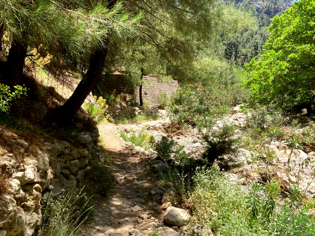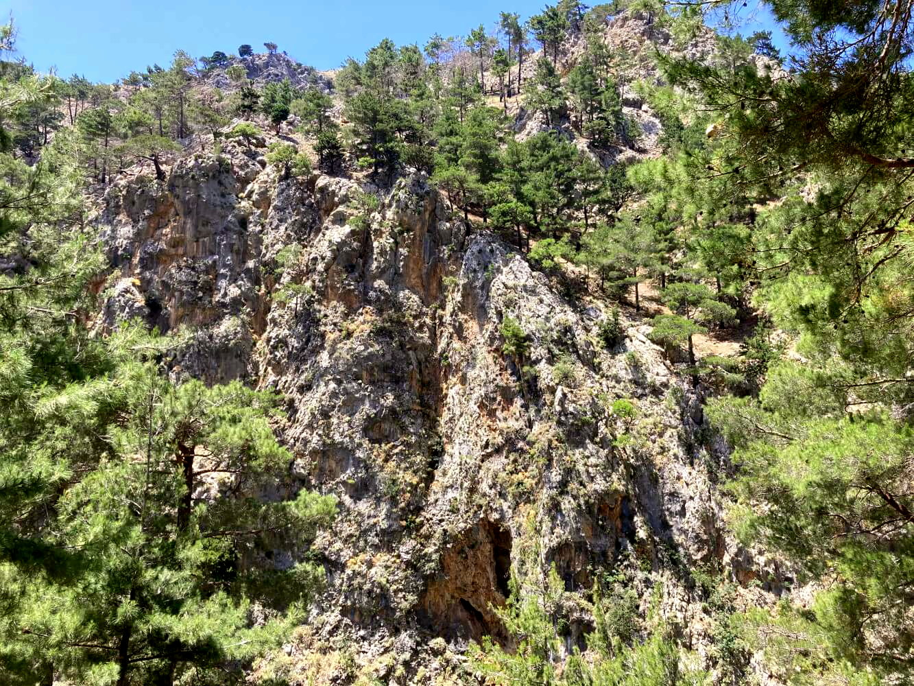 In stetem Auf und ab führt der Pfad durch die mediterrane Bilderbuchlandschaft. Sonnengebleichte Kalksteinwände erheben sich über mir und ich staune über die Bäume, die noch an den unmöglichsten Orten einen Platz finden, Wurzeln zu schlagen. Schließlich fällt das Gelände etwas auf und der Pfad wird zu einer Art Höhenweg. Neben dem Geländer auf meiner rechten geht es tief herunter, weit unten sehe ich das ausgetrocknete Flussbett.