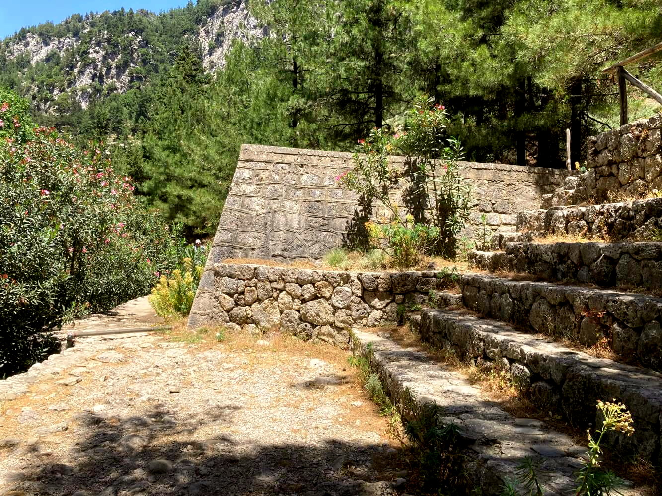 Durch den Bach ist die Vegetation in der Schlucht sehr üppig: Neben dem Weg präsentieren sich Wildblumen und Drachenwurz in voller Blüte. Schon nach kurzer Zeit öffnet sich der Blick und fällt auf die mit Kiefern bewaldeten Steilhänge der Schlucht. Trockenmauern säumen den Weg und nach ein paar Minuten erreiche ich den ersten Rastplatz – ein idyllisches Fleckchen an dem es sogar einen funktionierenden Brunnen gibt.