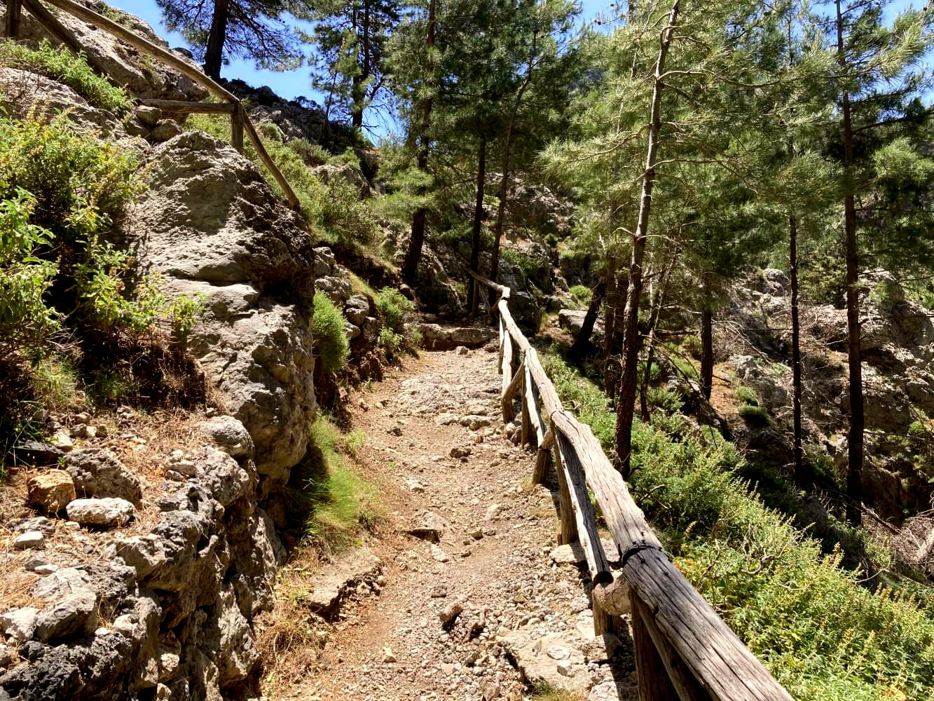 Bis auf ein paar kurze, etwas kraxelige Abschnitte, musst du aber nicht klettern und es gibt auch keine übermäßig steilen Abschnitte. Potentiell ausgesetzte Stellen sind mit Geländern gesichert, an kritischen Stellen finden sich zudem Markierungen. Wie auf Kreta üblich ist der Weg mit viel Geröll und groben Steinen bedeckt. Feste Wanderschuhe sind daher dringend ratsam.