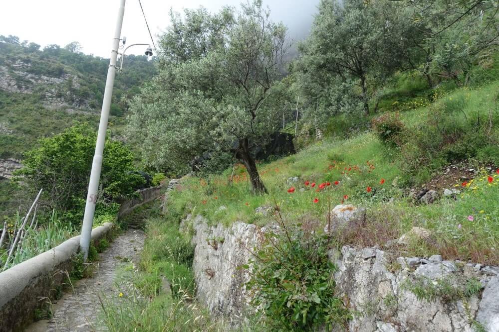 Der weitere Pfad verläuft ohne große Höhenunterschiede immer oberhalb des romantischen Valle delle Ferriere. Dieses Tal gilt als einer der schönsten Naturschutzgebiete Süditaliens. Theoretisch gäbe es auch einen Weg hinab, allerdings ist er stark verwildert und durch das steile Gelände auch nicht ungefährlich. Unser Panoramaweg bietet stattdessen schöne Blicke von oben ins Tal. An dem Sattel Sella di Monte Munillo (865 m) beginnt dann der Abstieg nach Pogerola und von dort über einen Treppenweg nach Amalfi.