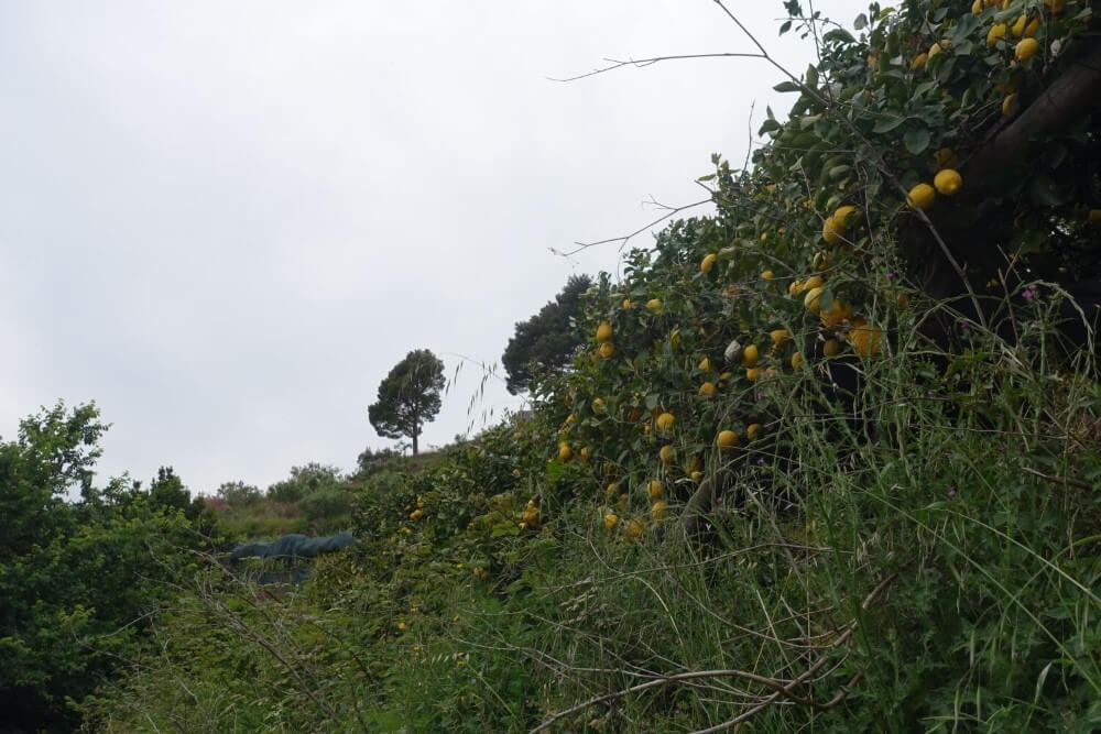 Der Sentiero dei Limoni ist als Panoramaweg angelegt, der größtenteils zwischen Obstplantagen, Gärten und natürlich immer wieder an Zitronenbäumen vorbei verläuft. Der knapp 3 Kilometer lange Weg ist befestigt und einfach zu laufen, allerdings streckenweise etwas überwuchert. Highlight sind die wunderbaren Ausblicke aufs Meer – von denen wir aber nichts haben. Der Himmel ist grau und wir laufen im Nieselregen an den Zitronen vorbei.