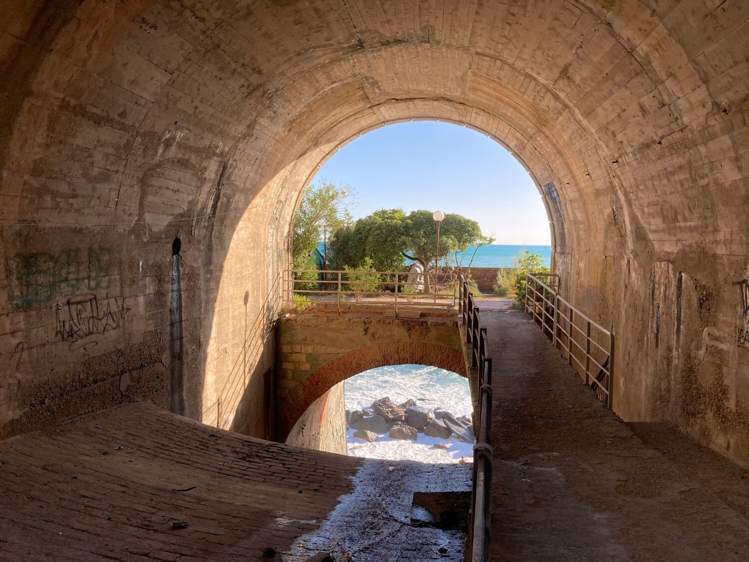 Wir laufen durch eine düstere, ungepflegt wirkende Gasse. Danach durch einen mit Graffiti beschmierten Tunnel, der an einer alten Wasserleitung vorbeiführt. Schließlich erreichen wir einen schiefen Bauzaun, der halb offensteht. Äh… was ist das bitte für ein Wanderweg? Aber gut – in Italien sieht man so etwas lockerer. Wir gehen weiter.