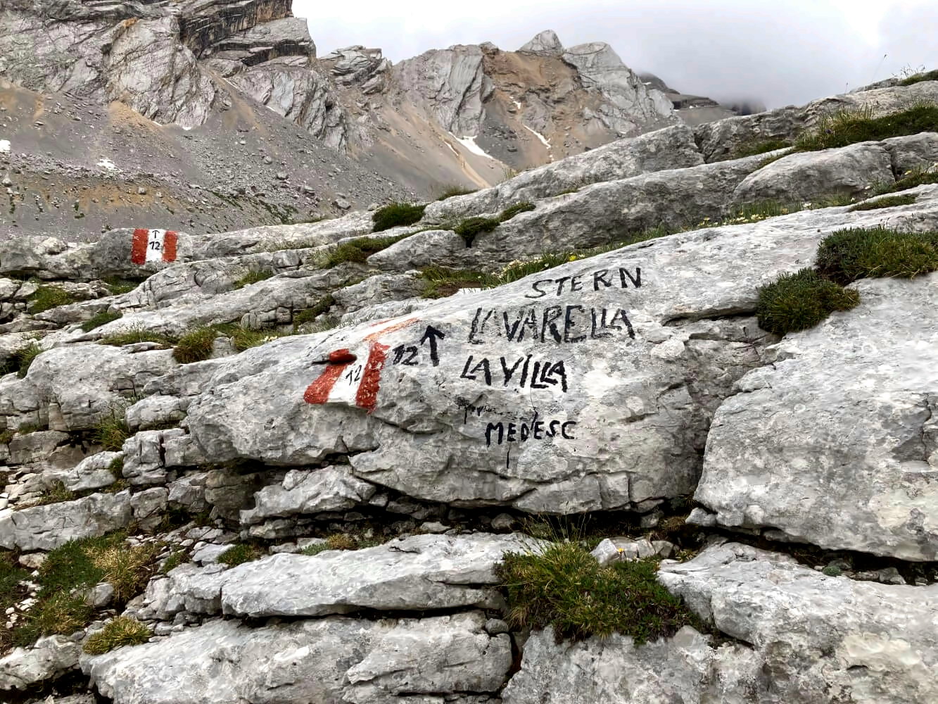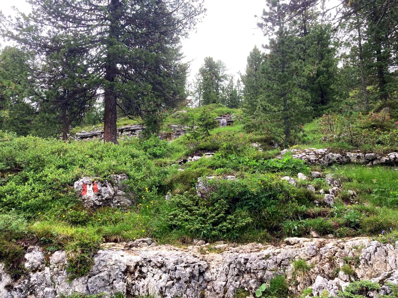 Am Lavarella-Sattel angekommen, löst sich der Wanderweg in einen schwach erkennbaren Trampelpfad auf. Immerhin gibt es aber noch sporadische Markierungen auf den Felsen. Wenn du den Gipfel besteigen willst, solltest du kleineren Kraxeleien auf jeden Fall nicht abgeneigt sein. Außerdem wird der Weg immer rutschiger, je höher es geht.