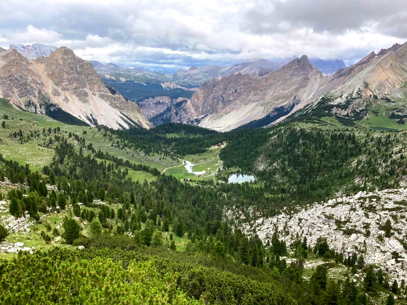 Von Fodara Vedla folgst du zunächst einer Straße, die sich recht steil talwärts zieht und schöne Blicke ins Rautal (Val dai Tamersc) unter den schroffen Felswänden der Sas de Crosta bietet. Schon nach einer guten Stunde erreichst du die große Ücia Pederü. Hier gibt es sogar eine Busanbindung, dementsprechend zivilisationsnah fühlt sich die Hütte an. Für eine Übernachtung wäre mir das nicht romantisch genug.