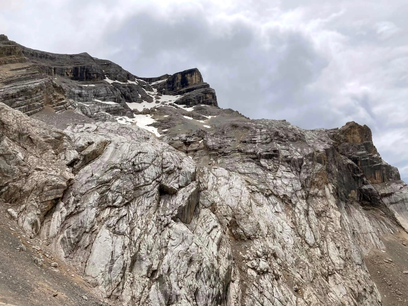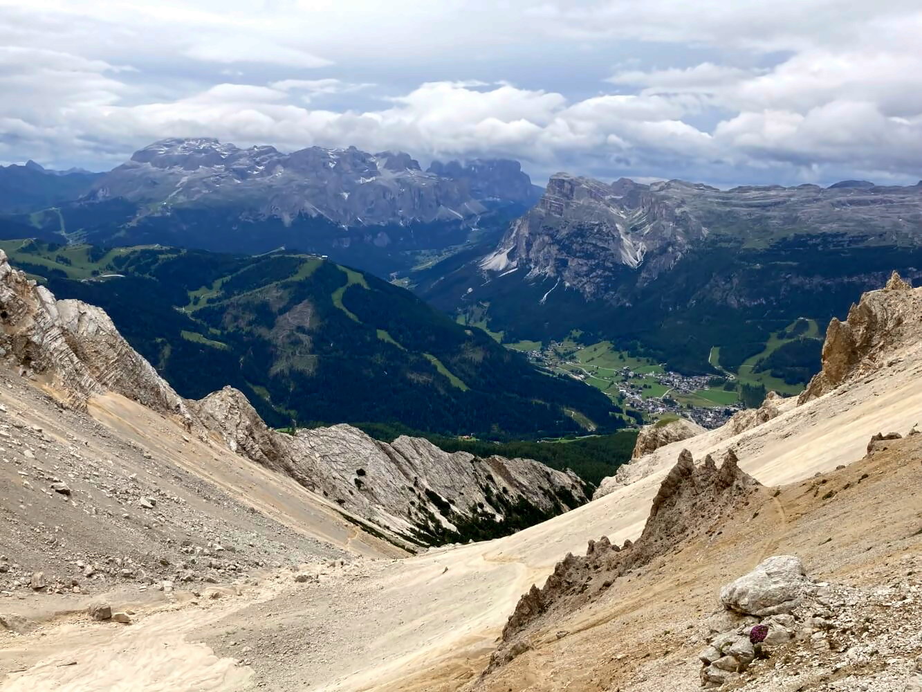 Blick zurück auf auf die in düstere Wolken gehüllte Lavarella-Spitze.