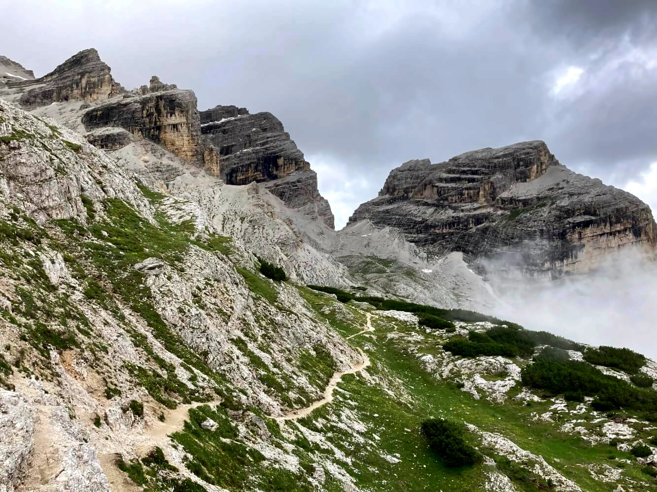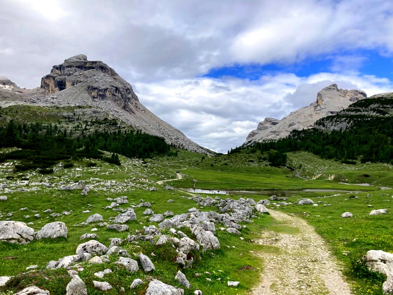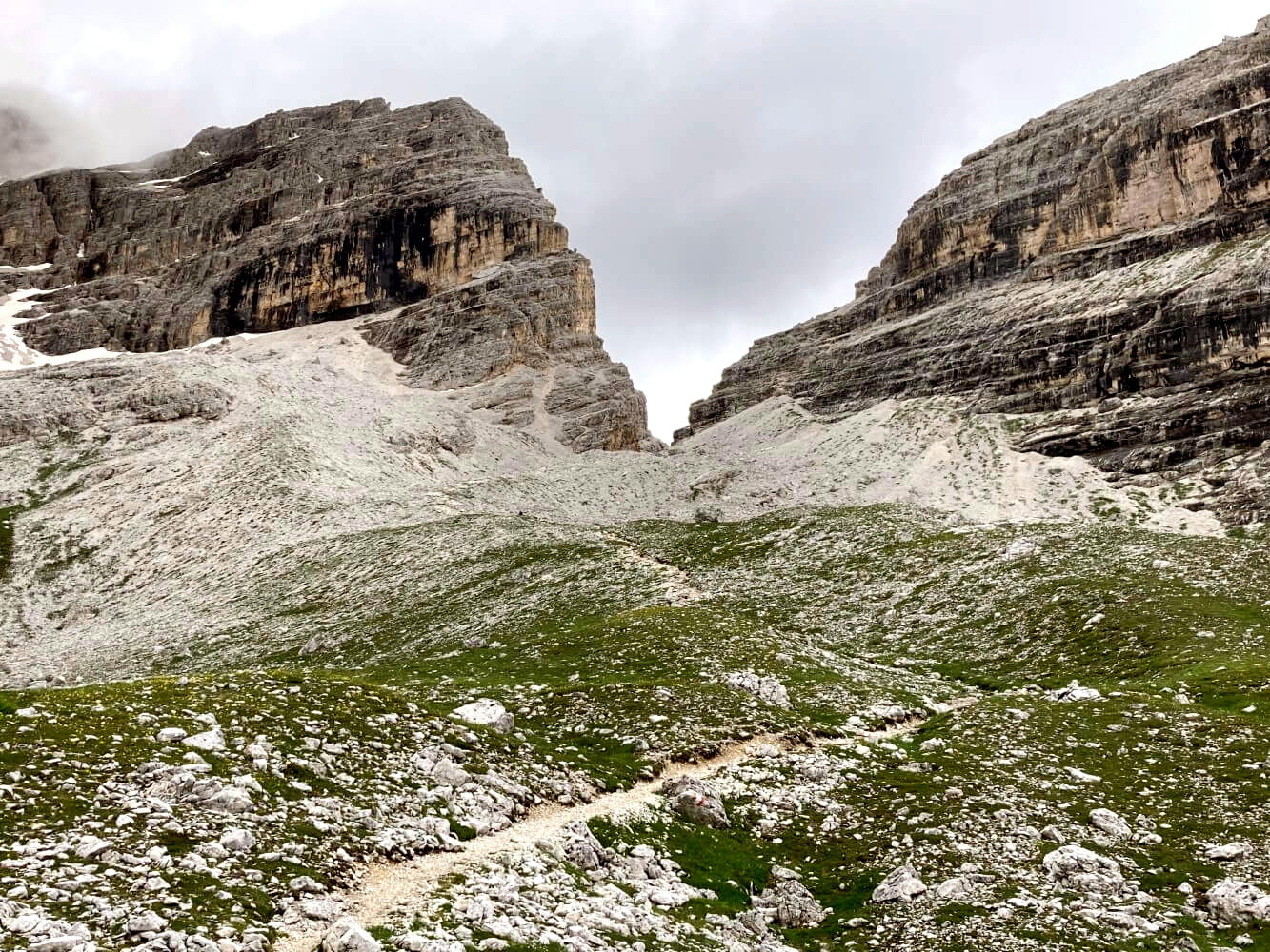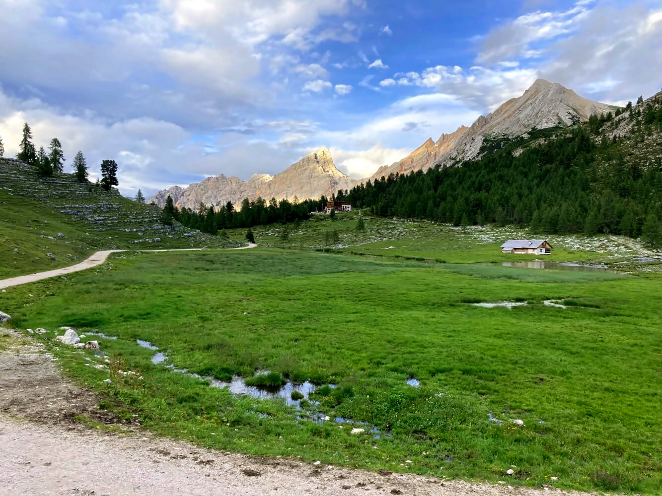 Von hier aus folgst du dem Weg Nr. 11 über weite Wiesenflächen an den Felsstürzen des Munt de Gran Fanes vorbei. Es gibt einige kleinere Trampelpfade, sodass du nicht auf dem Hauptweg laufen musst, der hier doch recht stark frequentiert ist. Vor dem Eingang ins Valun de Ciampestrin zweigt Weg Nr. 20 B ab, der jetzt etwas steiler zur Forcella di Lech aufsteigt.