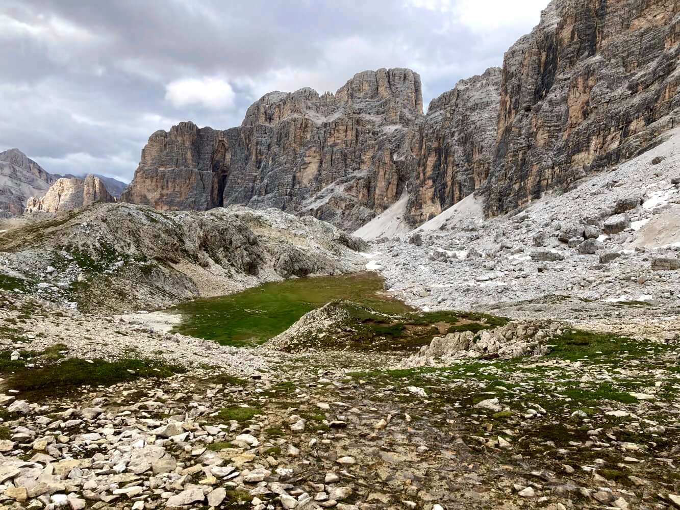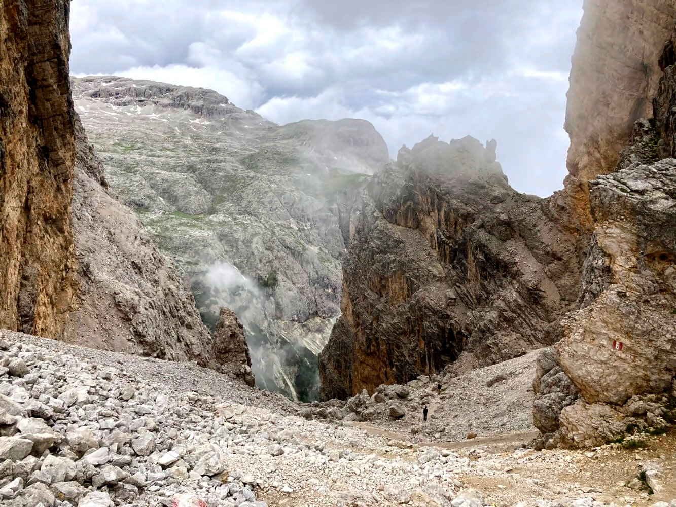 An der Scharte angekommen, bietet sich dir ein umwerfender Tiefblick zum Lagazuoi-See, der in einem kleinen Tal zwischen den mächtigen Felswänden türkisblau schimmert. Als ich da war, zogen leider dichte Wolkenbänke durchs Bild, sodass ich nur einige schwache Blicke auf das winzige Seenauge erhaschen konnte.