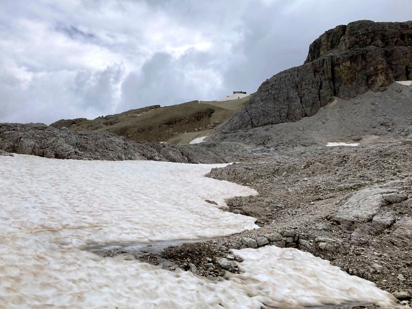 Vor der Lagazuoi-Scharte wird das Gelände felsiger. Über weite Geröllfelder führt Weg Nr. 401 bis hoch zur Hütte. Unterwegs kommst du an einigen Baracken der Österreicher vorbei, die hier im ersten Weltkrieg Stellung bezogen, um den strategisch wichtigen Falzarego-Pass im Tal südlich zu kontrollieren. Der gesamte Gipfelbereich des Lagazuoi ist eine Art Freilicht-Museum, in dem sich noch viele Überreste aus dieser Zeit befinden.
