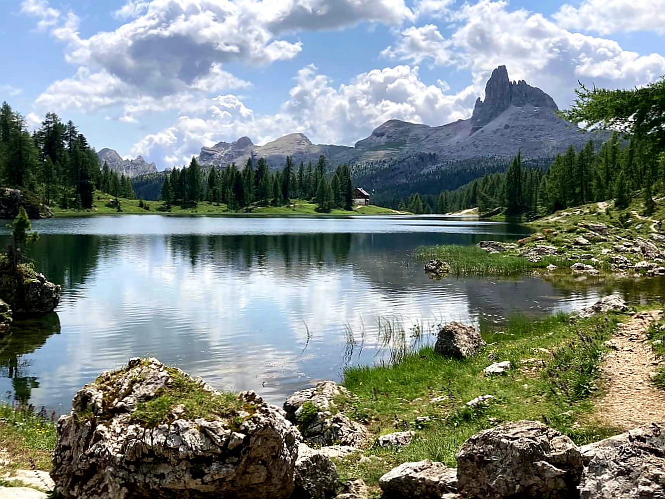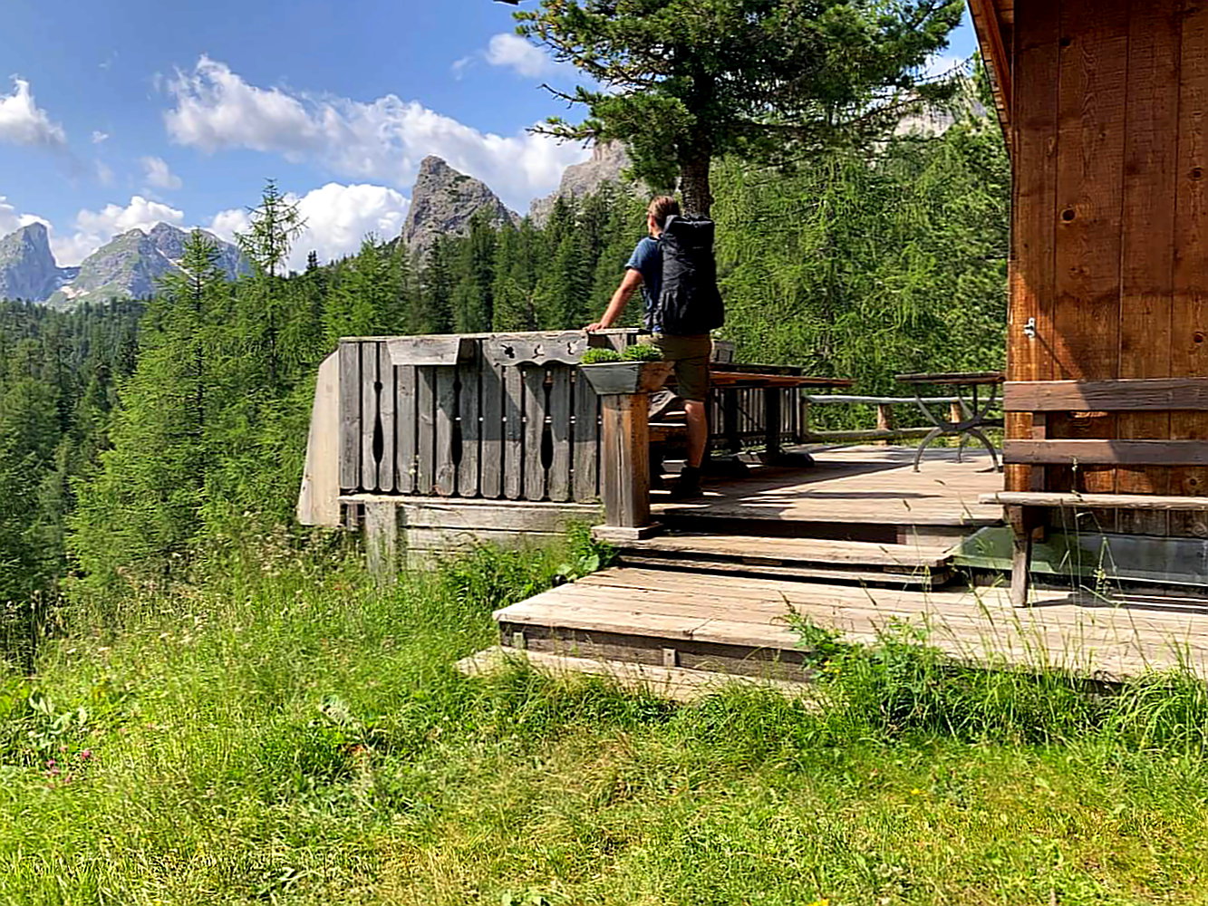 Kurze Zeit später erreichst du den traumhaft schönen Lago Federa, an dessen Ufern das Rifugio Croda da Lago zu einer Mittagspause auf der Sonnenterrasse einlädt. Hier wirst du möglichweise sehr starke Lust bekommen, den Tag bereits hier zu beenden. Wenn du die folgenden Tage etwas anders gestaltest, ist es auf jeden Fall der perfekte Ort für einen ausgedehnten Zwischenstopp.