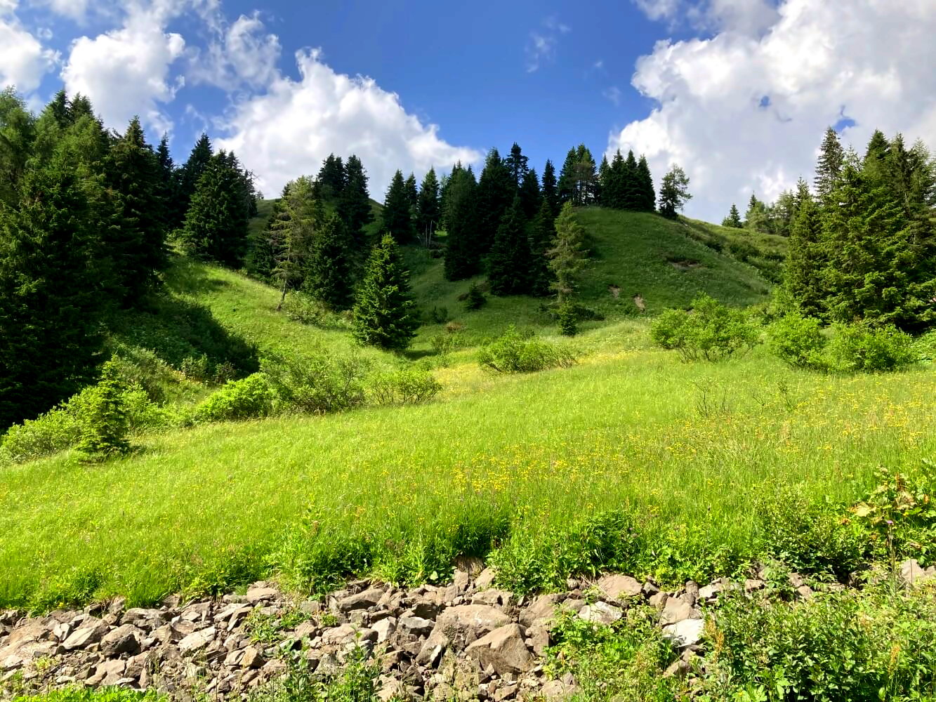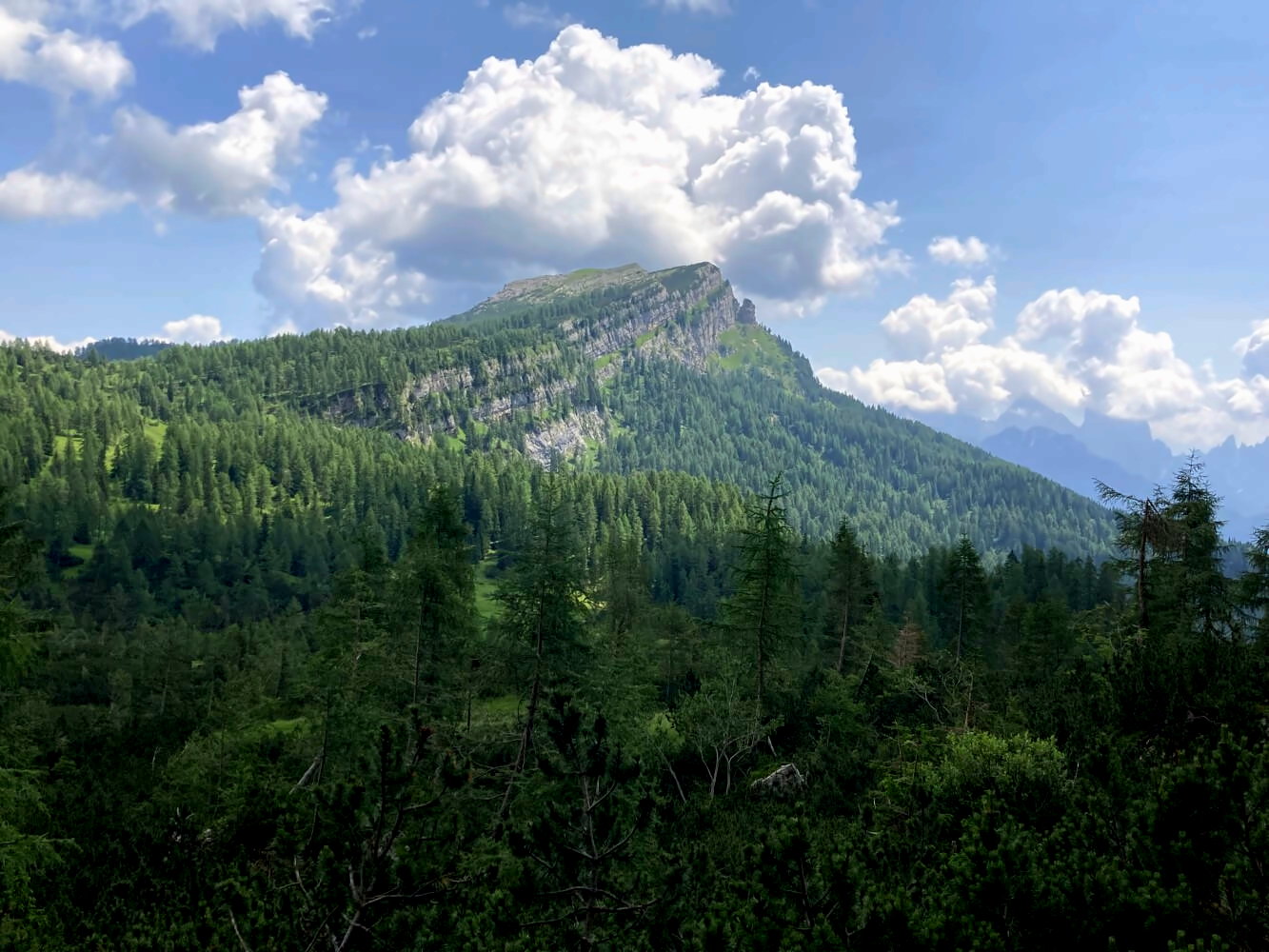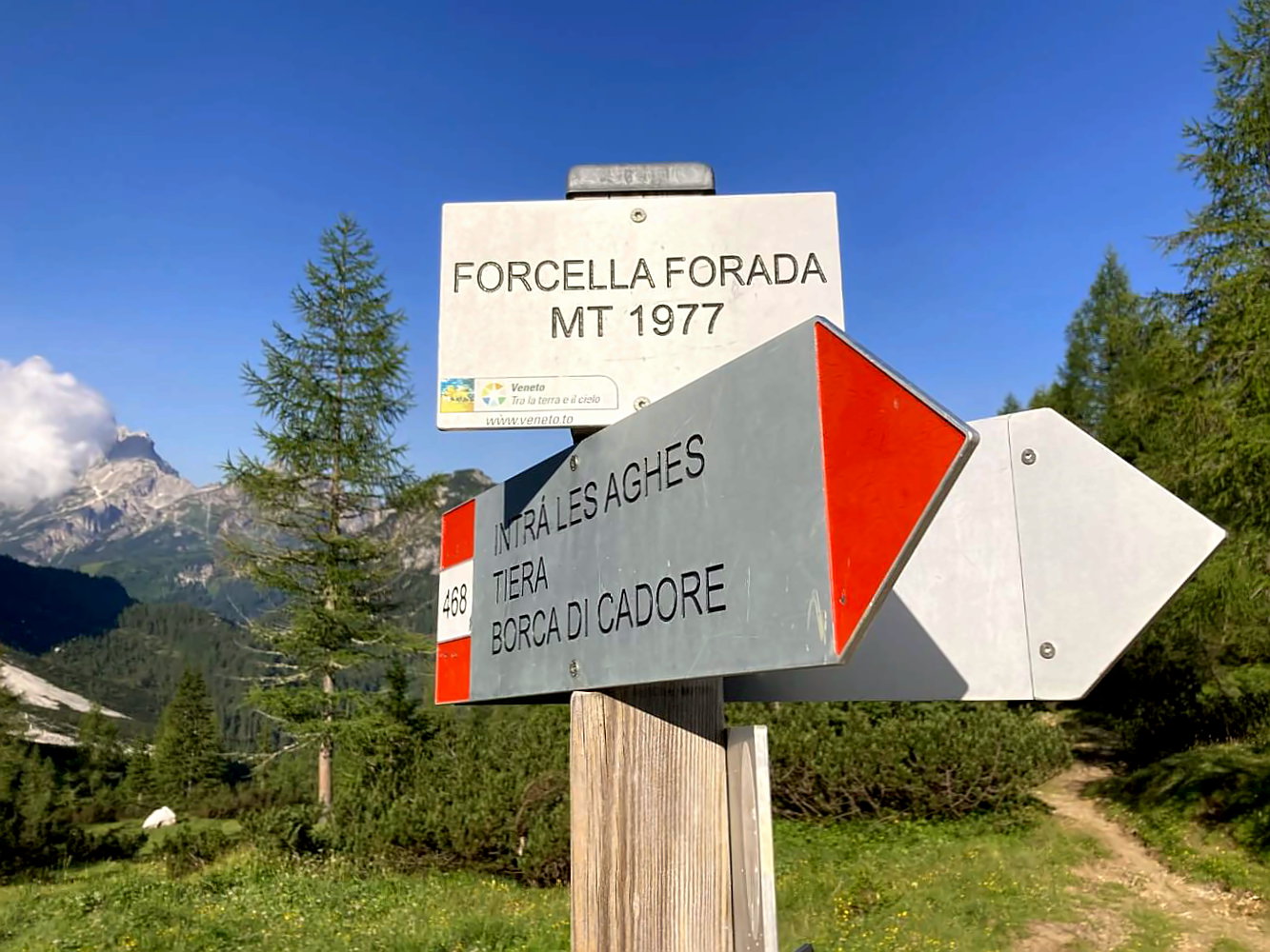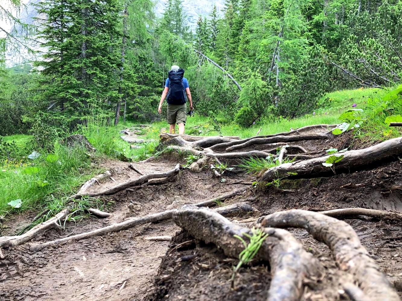 Der folgende Weg Nr. 472 durch das dicht bewaldete Val di Zoldo ist deutlich angenehmer. Es geht leicht absteigend durch eine offene Landschaft mit tollen Ausblicken auf die Nordwände der Civetta. Teilweise führt der Weg über Holzbohlen und Wurzeln, was nach dem ganzen Rumgeschottere eine schöne Abwechslung darstellt.