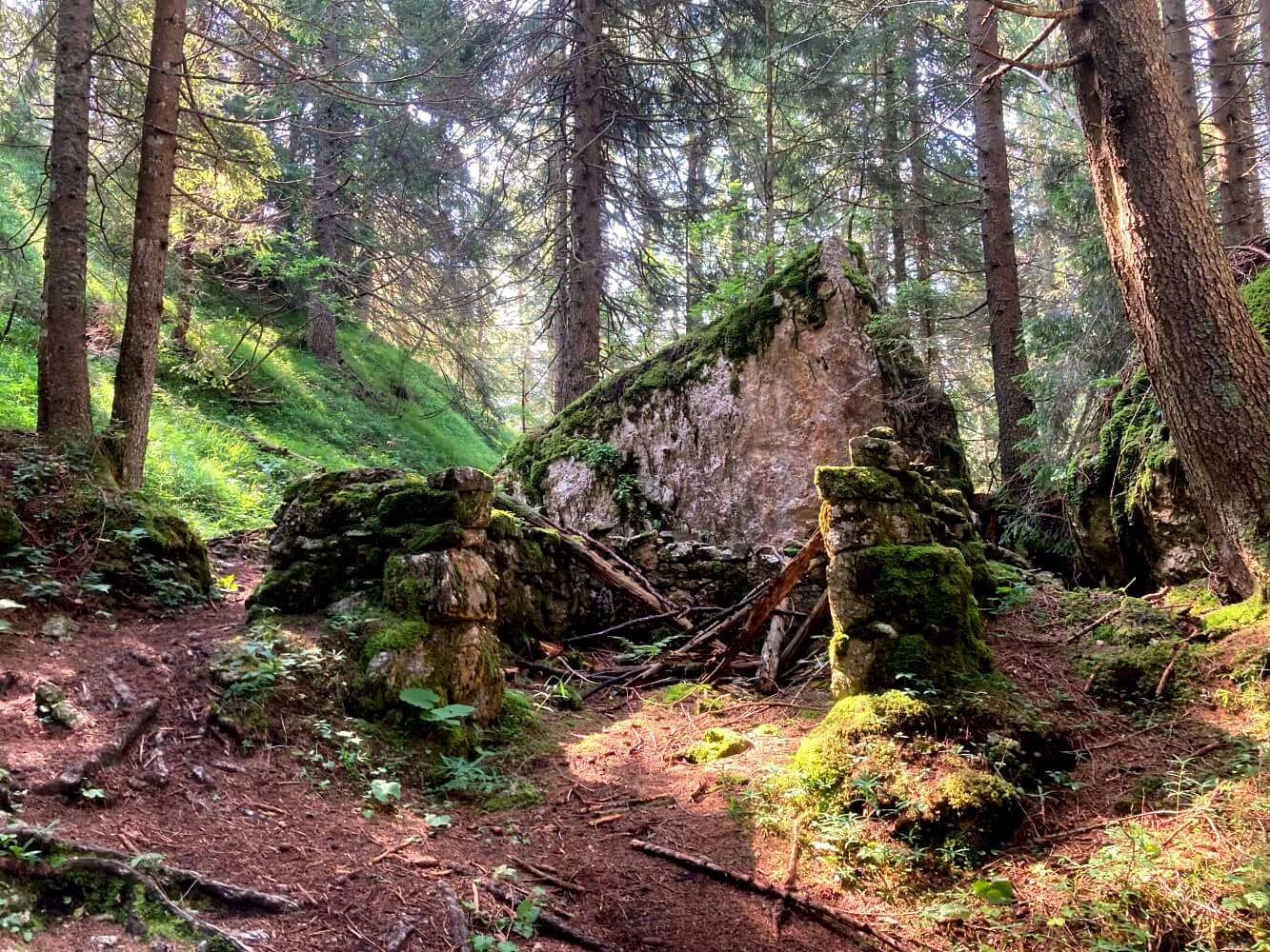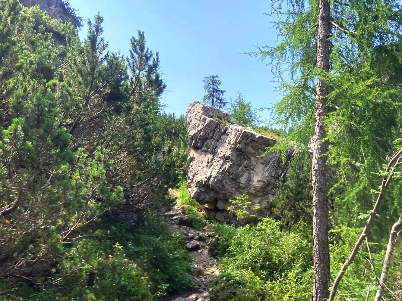 Nördlich von dir wirst du einige interessante Felsformationen erkennen. Die Steine sehen wie eine versteinerte Gruppe von Figuren aus, die dich von oben betrachten. Auch der Blick nach Süden über die ausgedehnten Kiefernwälder und den mächtigen Monte Zedo, der sich über das Tal von Agordino erhebt, ist bombastisch.