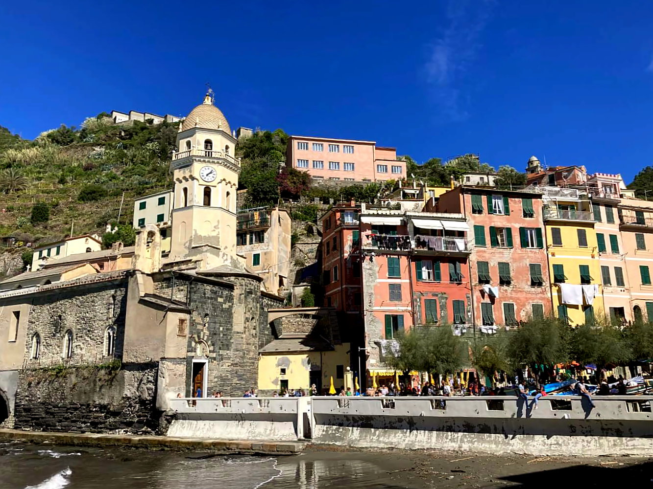 Vernazza wird in verschiedenen Reiseführern als schönstes Dorf der Cinque Terre bezeichnet und sieht von oben wirklich sehr schön aus. Über dem kleinen Hafen thront die Kirche Santa Margherita di Antiochia mit ihrem zierlichen Glockenturm, dessen Kuppel in der Sonne funkelt. Die Halbinsel wird von der alten Festung Castello Doria dominiert – auf den Turm kannst du hochklettern und das Städtchen von oben bewundern. Kostenpunkt: 2 Euro.
