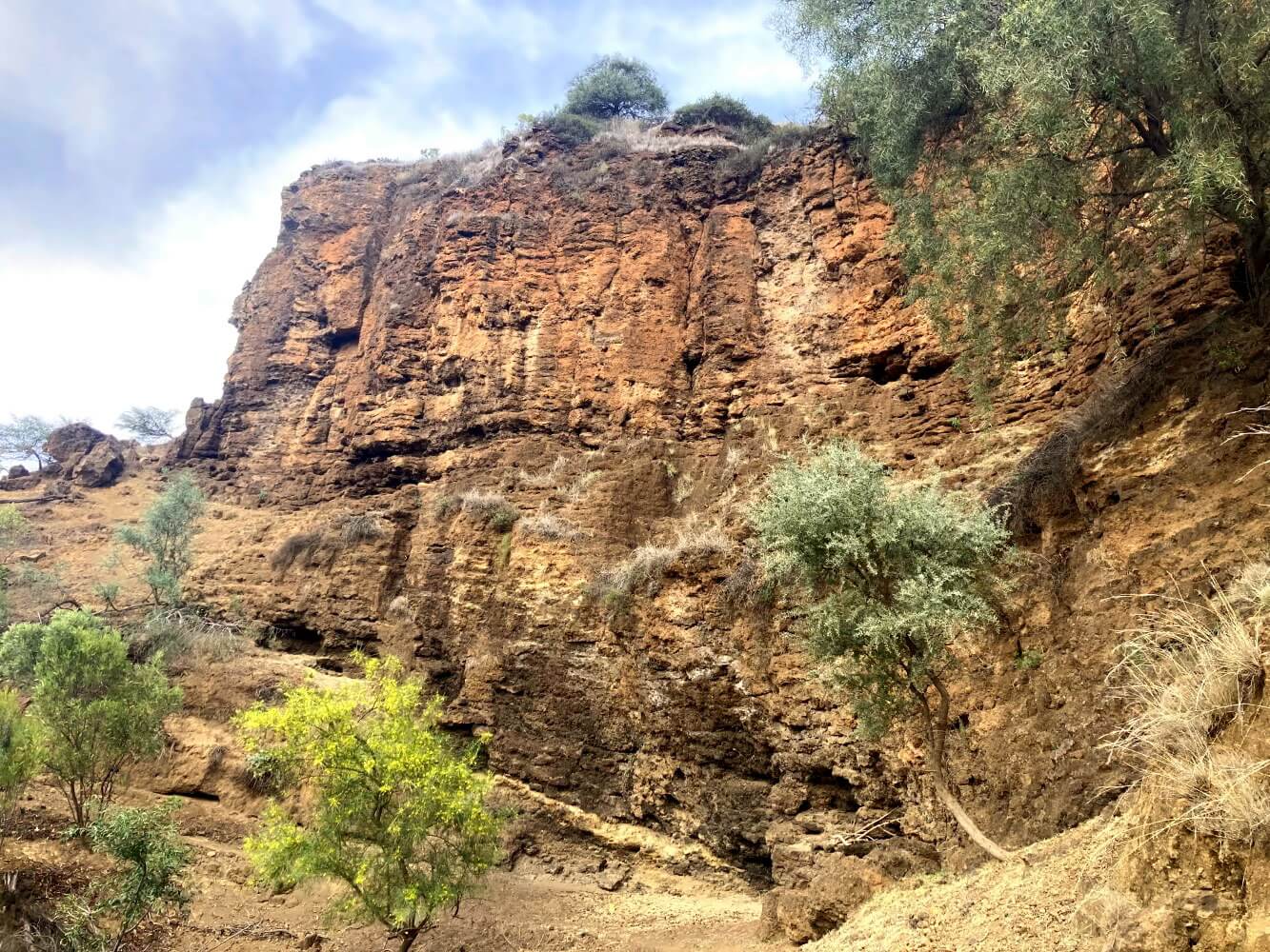 Unterwegs kommen wir an verlassenen Häusern und einigen Felshöhlen vorbei. Warum hier niemand mehr wohnt, ist eigentlich klar: Es ist viel zu trocken. Dass es in dieser Einöde überhaupt Häuser gibt, fühlt sich irgendwie nicht richtig an. Da passt der Morrinho de Passagem, den wir auf 200 Höhenmetern passieren, schon besser ins Bild. Der rostrote Aschehaufen ist einer der vielen kleineren Vulkanberge zu Füßen des Pico-da-Cruz-Massivs.