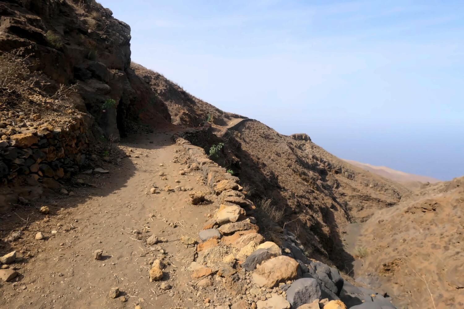 Nach einem anstrengenden Marsch durch die gleichförmige Landschaft erreichen wir das architektonische Highlight der Etappe: Den Caminho durch das Ribeira de Azulheiros. An dieser Stelle hat sich eine gewaltige Erosionsrinne in die südlichen Ausläufer des Coroa-Massivs gefräst. Der Weg umgeht diese so, wie jedes Hindernis in Santo Antão überwunden wird: Auf der einen Seite runter, auf der anderen wieder rauf.