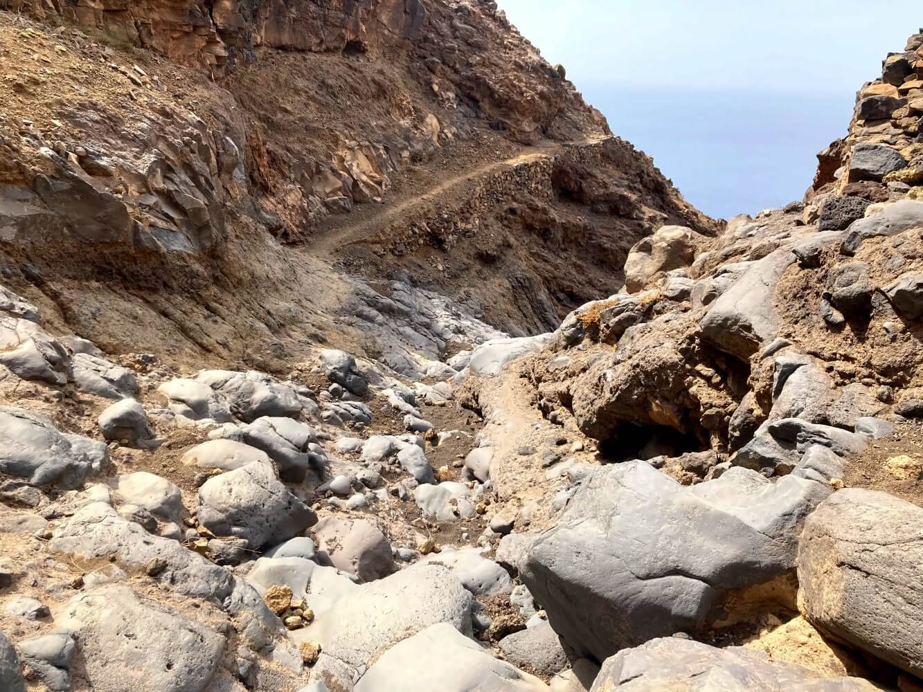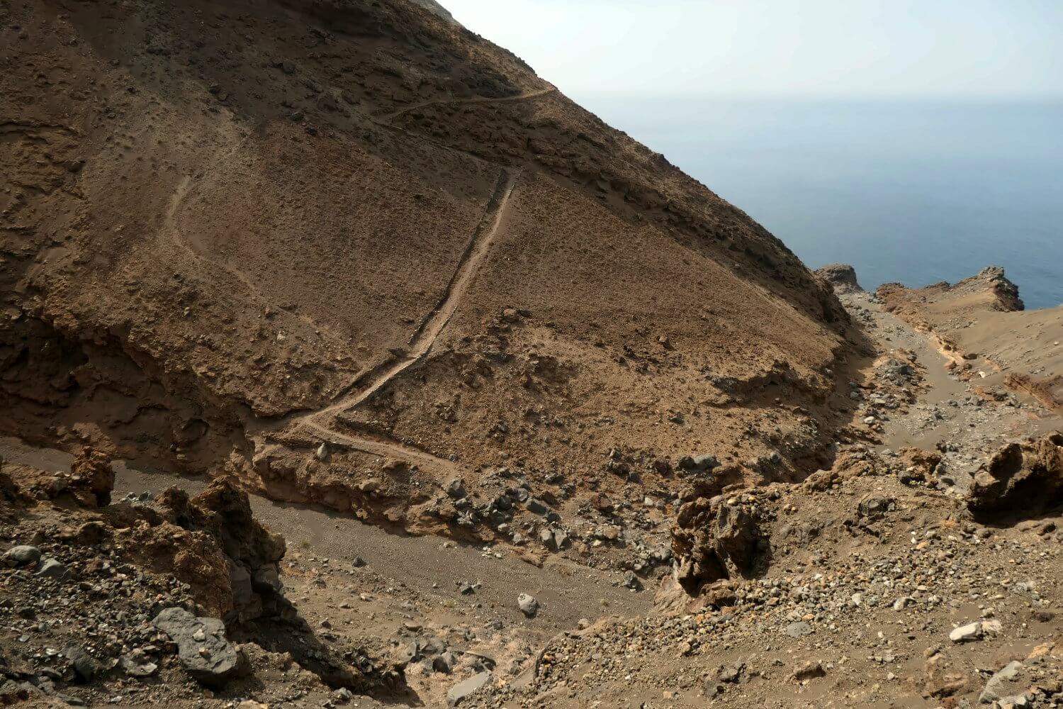 Immer den Tope im Blick folgen wir der Küste, bis wir schließlich zu einer großen Erosionsrinne gelangen. Der Weg ist hier ein Stück verschüttet, man kann aber auch so ganz gut herunterkraxeln. Auf der anderen Seite geht es leicht bergan und schon nach kurzer Zeit folgt die nächste, sogar noch tiefere, Rinne. Dieses Spiel wird sich jetzt noch ein paar Mal wiederholen. Zum Glück sind es aber meist nur kurze Abstiege.