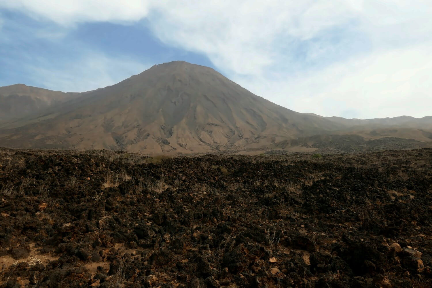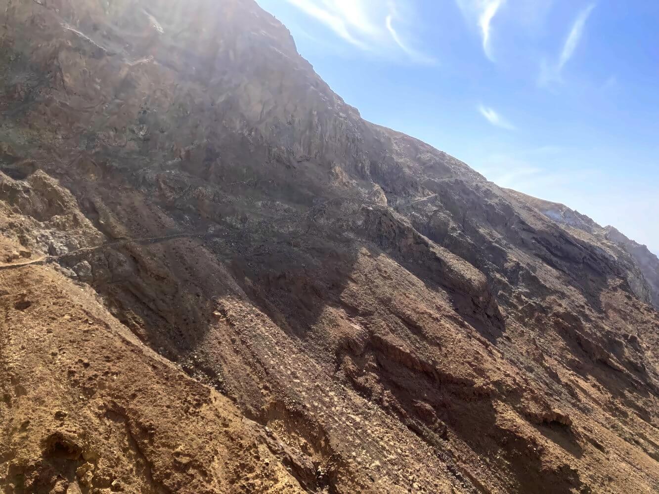 Die Landschaft sieht ähnlich aus wie gestern, will heißen: Braun, steinig, extrem karg. Pflanzen gibt es bis auf ein paar verdorrte Grasbüsche so gut wie gar nicht. Trotzdem treiben sich ein paar Ziegen zwischen dem Lavagestein herum. Wie zu erwarten war, ist es drückend heiß. Dank der Nähe zum Meer ist es aber nicht ganz so unerträglich wie gestern.