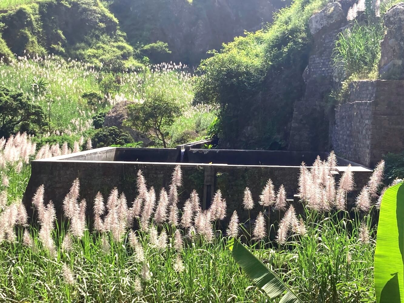 Kurz vor dem Örtchen Lombinho geht es wieder auf die Straße, die sich aber immer noch mehr wie ein Wanderweg anfühlt. Zu beiden Seiten erstrecken sich Zuckerrohrfelder, Yams-Plantagen und Bananenstauden. Manchmal läuft man im Schatten von Palmen, Mango – und Affenbrotbäumen. Im Hintergrund die steilen Felswänder der Cabo da Ribeira. Ein tropisches Paradies wie aus dem Bilderbuch!