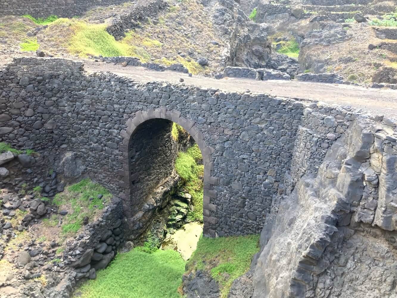 Im Prinzip geht es einfach nur ein kurzes Stück auf der Straße an der Nordküste entlang. Viele Autos sind aber nicht unterwegs und wie bereits in den letzten Tagen fühlen sich die gepflasterten Straßen in Santo Antão auch nicht großartig viel anders an, als die Wanderwege. Sehr schön sind die Aussichten zum Meer und den Wellen, die in meterhohen Gischfontänen an der Steilküste zerschellen.