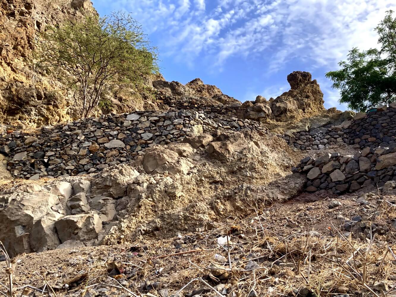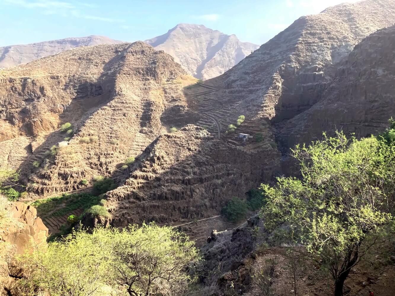 Von hier geht es mit tollen Blicken auf den Atlantik in den benachbarten Canyon Ribeira das Chapas herunter und dann ein ganzes Stück in stetigem Auf und Ab an der Küste entlang. Viele der Terrassen in diesem Teil der Insel sind aufgegeben, da die Landschaft völlig ausgetrocknet ist. Der Kontrast zwischen den kargen Berghängen und dem Blau des Ozeans – dazwischen das schmale Band des Caminhos – ist trotzdem sehr schön.