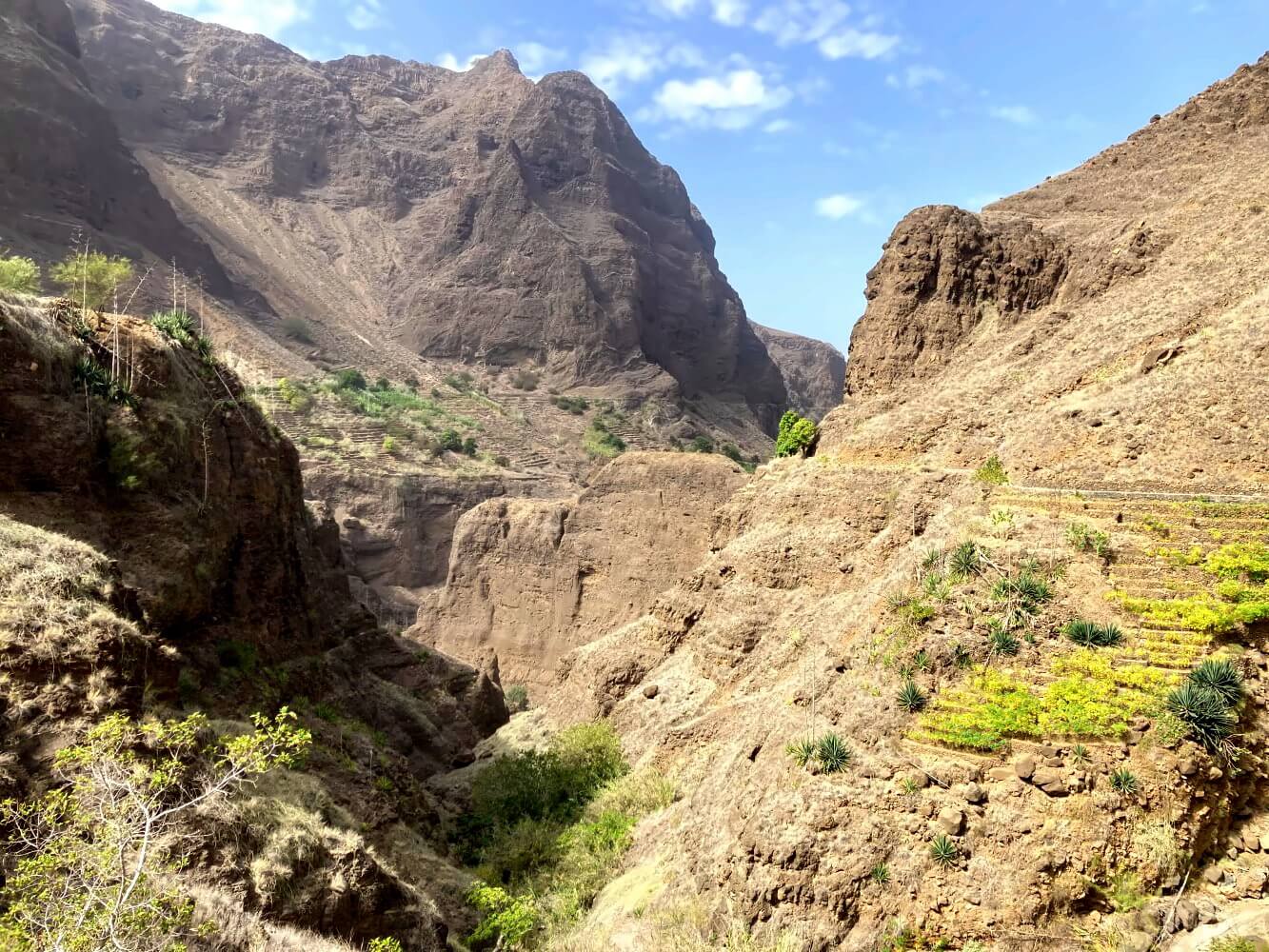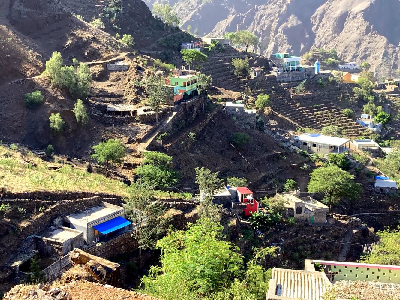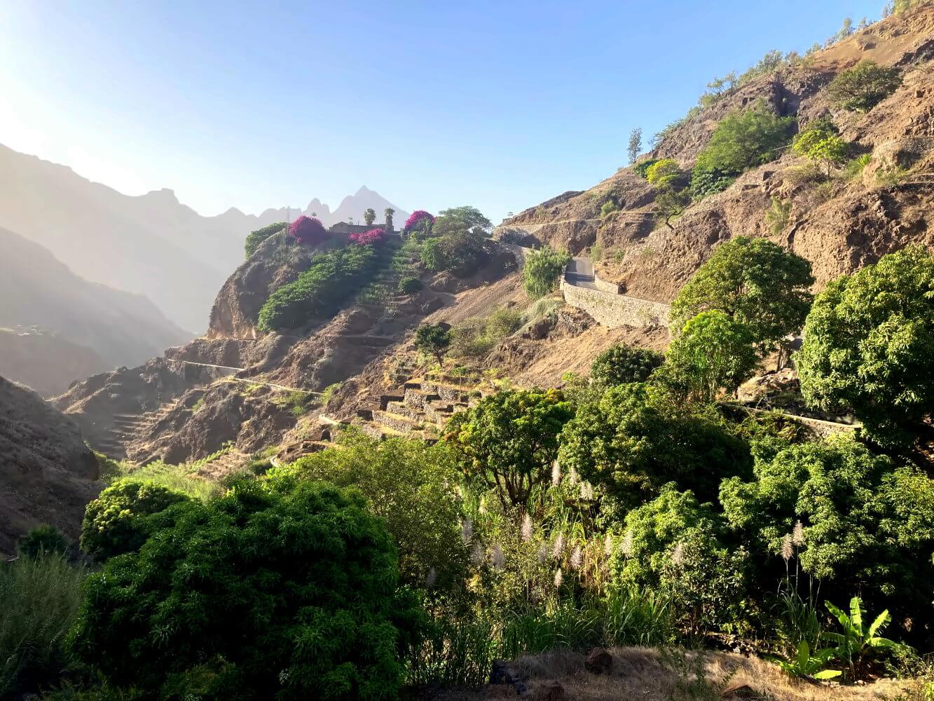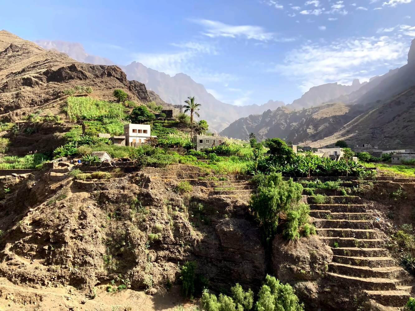 Ab diesem Zeitpunkt wird die Wanderung etwas anstrengender, da die Geländestufen nicht nur bestaunt, sondern auch bestiegen werden wollen. Dafür werden aber auch die Aussichten mit jedem Moment besser. Grüne Terrassen mit Zuckerrohr, Palmen, dazwischen die hübschen weißgeputzten Häuschen aus denen afrikanische Pop-Musik herüberschallt – und das alles vor dem wahrscheinlich besten Hochgebirgspanorama von Santo Antao. Genial!