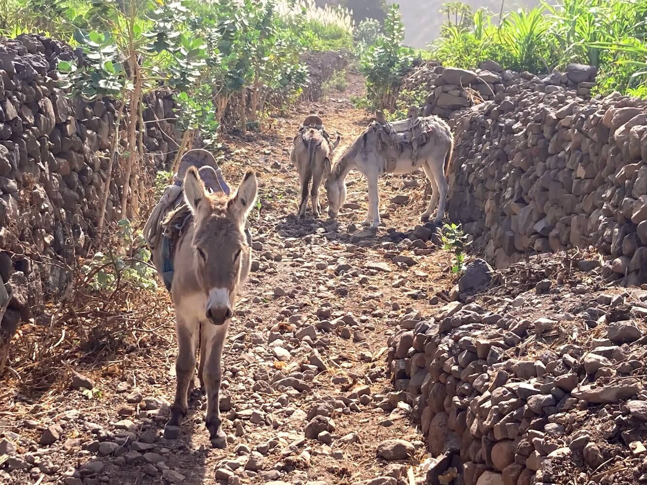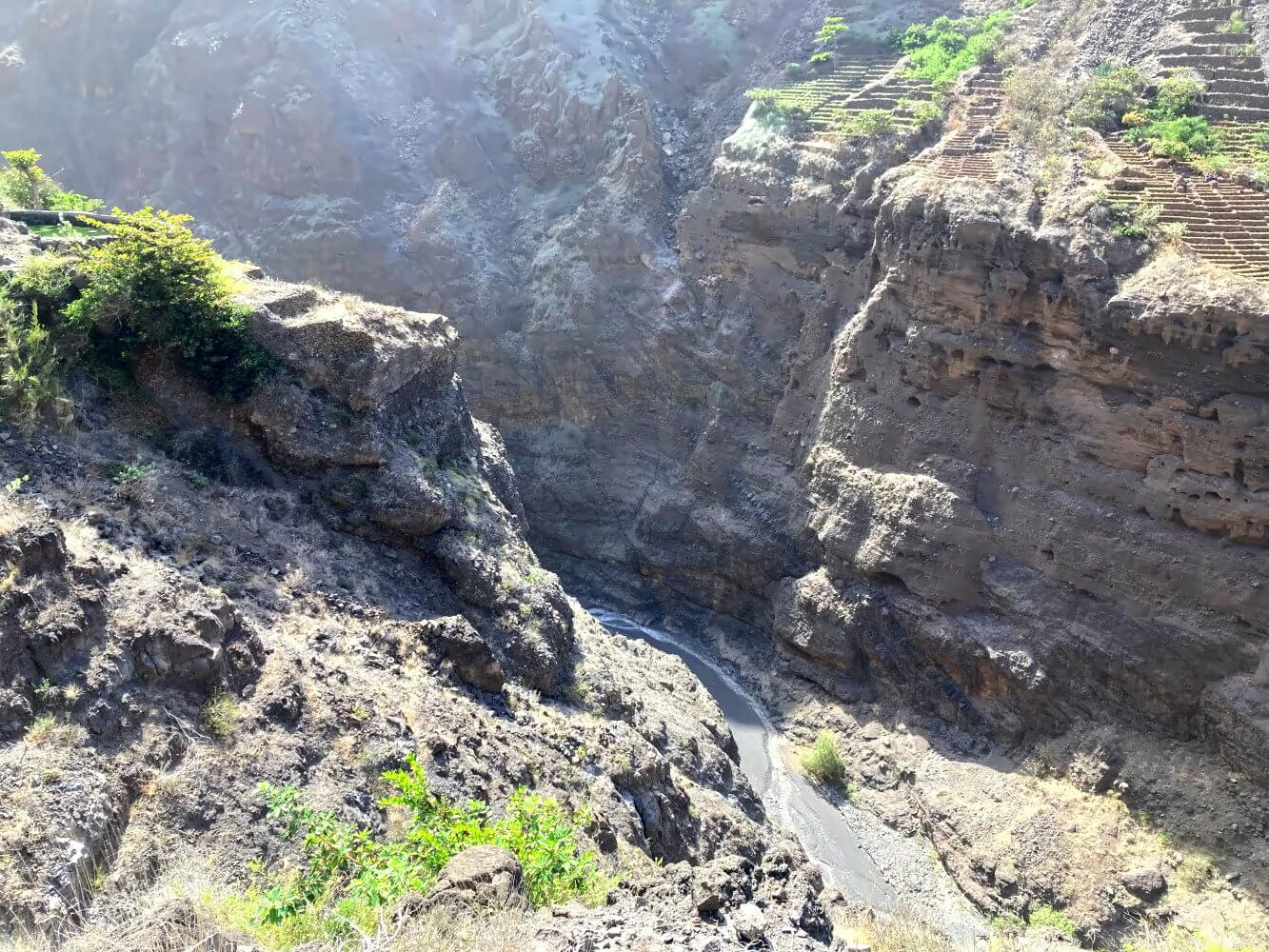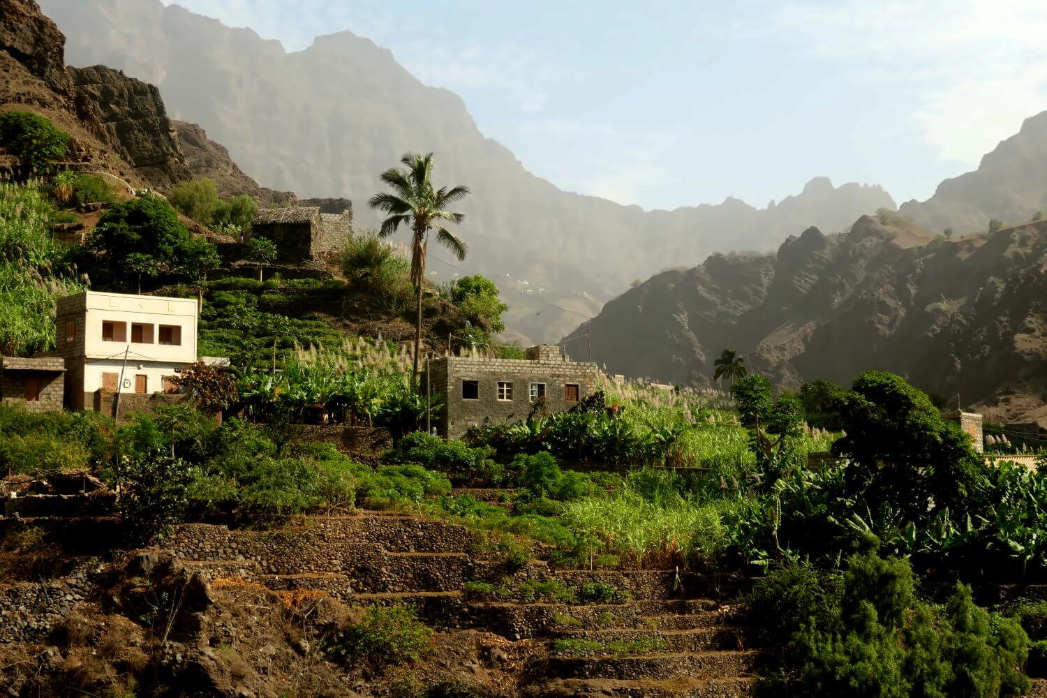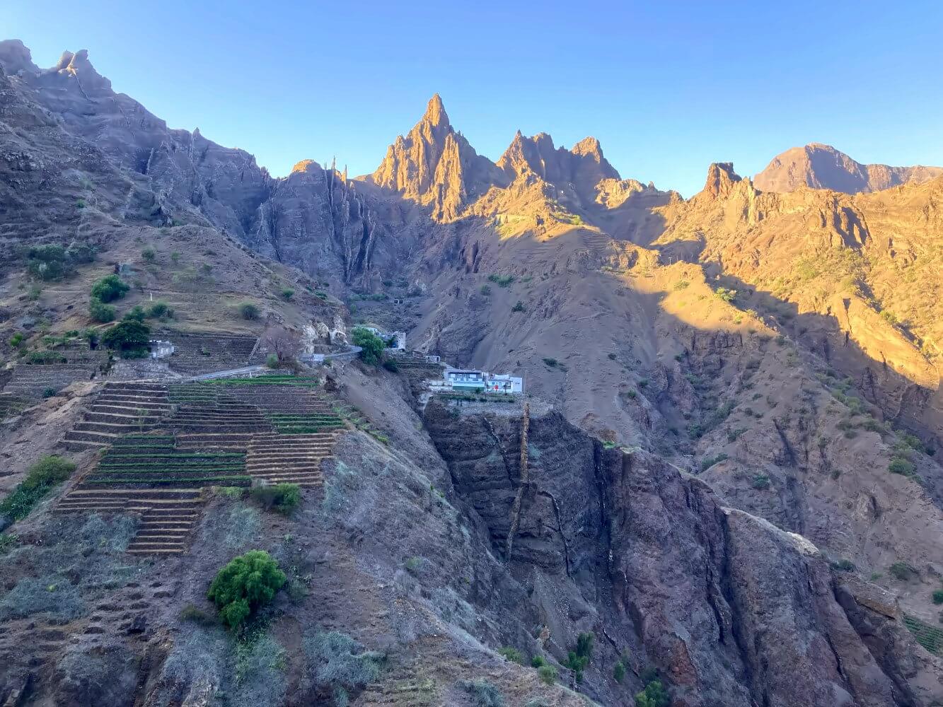Ab diesem Zeitpunkt wird die Wanderung etwas anstrengender, da die Geländestufen nicht nur bestaunt, sondern auch bestiegen werden wollen. Dafür werden aber auch die Aussichten mit jedem Moment besser. Grüne Terrassen mit Zuckerrohr, Palmen, dazwischen die hübschen weißgeputzten Häuschen aus denen afrikanische Pop-Musik herüberschallt – und das alles vor dem wahrscheinlich besten Hochgebirgspanorama von Santo Antao. Genial!