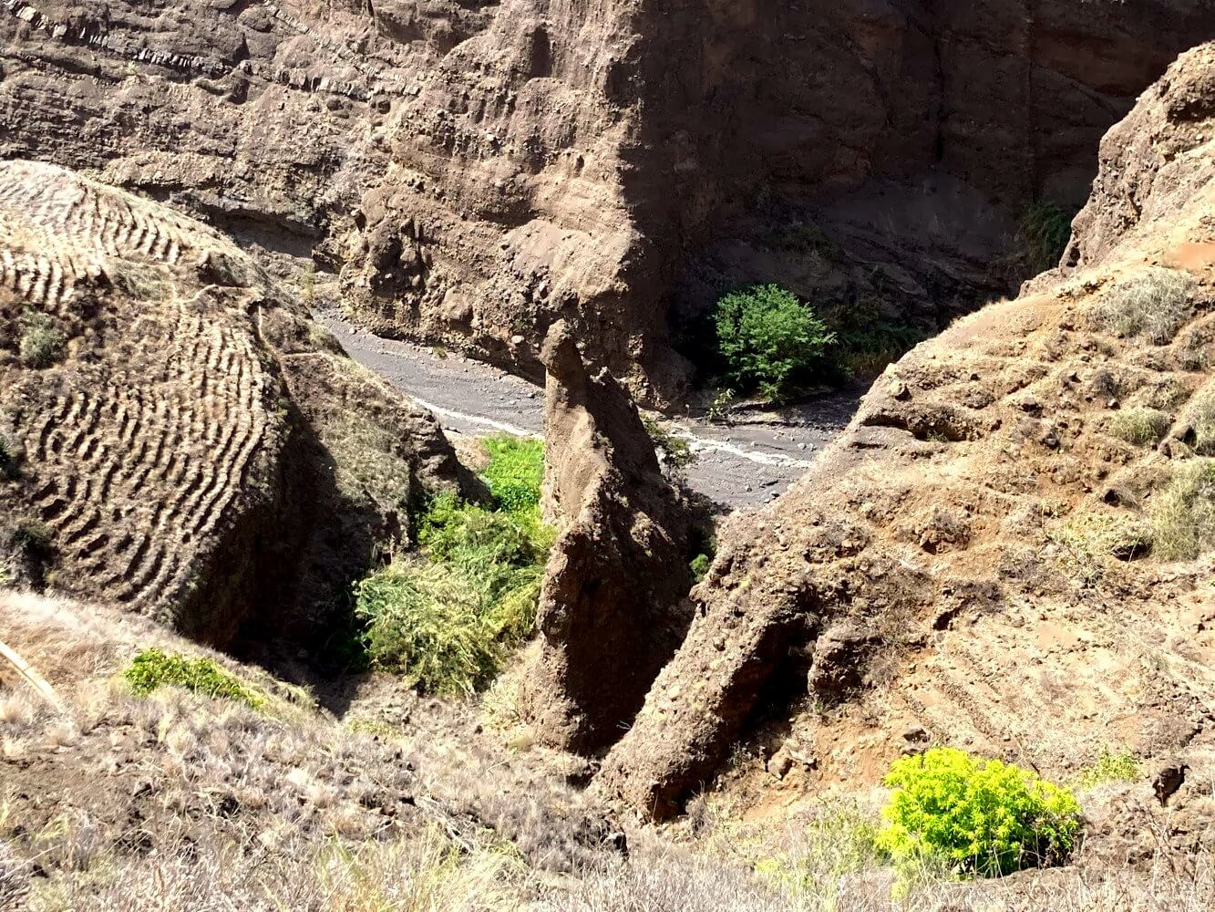 Von Branquino aus führt auch ein auf der Karte eingezeichneter Trampelpfad zu einigen Terrassen auf der linken Schluchtseite. Davon aber nicht täuschen lassen: Der Weg endet nach ein paar hundert Metern im Nirgendwo. Du musst zuerst runter zum Strand und dann auf der rechten Seite des Canyons wieder hoch. Von dort aus geht es dann auf einem klar erkennbaren, sicheren Weg immer am oberen Rand der Schlucht entlang nach Süden.