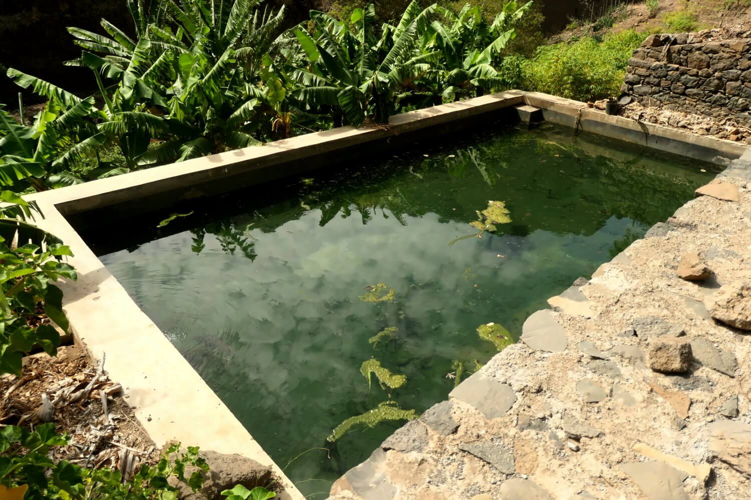 Nach etwa 1,5 Kilometern entlang einer Levada erreichst du ein großes Wasserbecken im Schatten von Bananenbäumen, ein schöner Ort für eine Pause. Kurze Zeit später siehst du rechts unter dir eine markante Felsnadel, zu der ein Weg durch verlassene Terrassen herabführt. Ich vermute, das ist der besagte Weg Nr 305a. Auf der anderen Seite der Schlucht verliert er sich aber wieder rasch in unwegsamem Gelände.